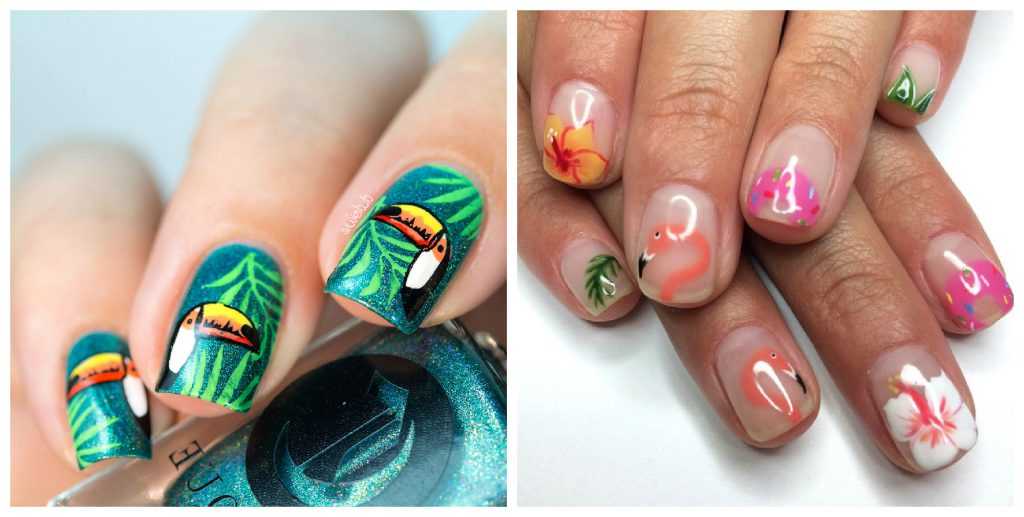 Невероятно нежно и мило на женских ноготках выглядят рисунки розовых фламинго, дополняющие роскошные тропические заросли. Подобные пляжные зарисовки очаруют практически всех любителей пляжного отдыха у моря.