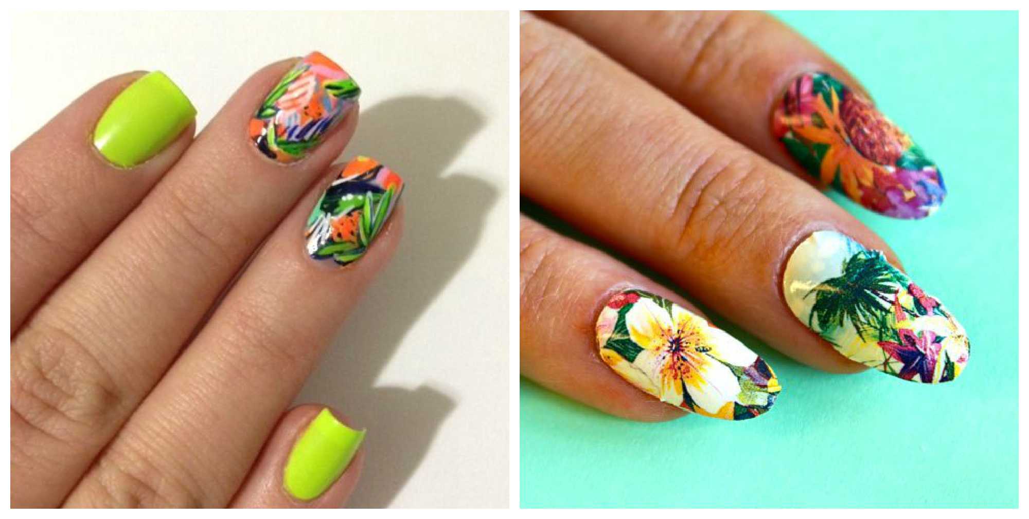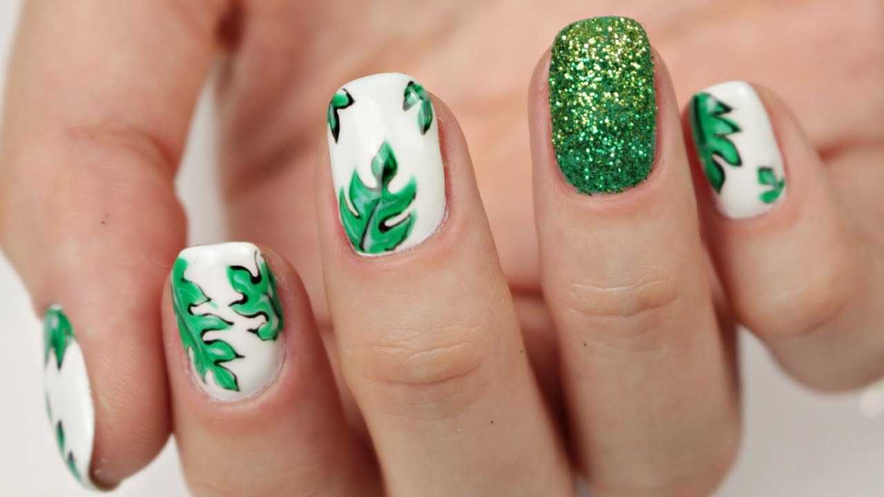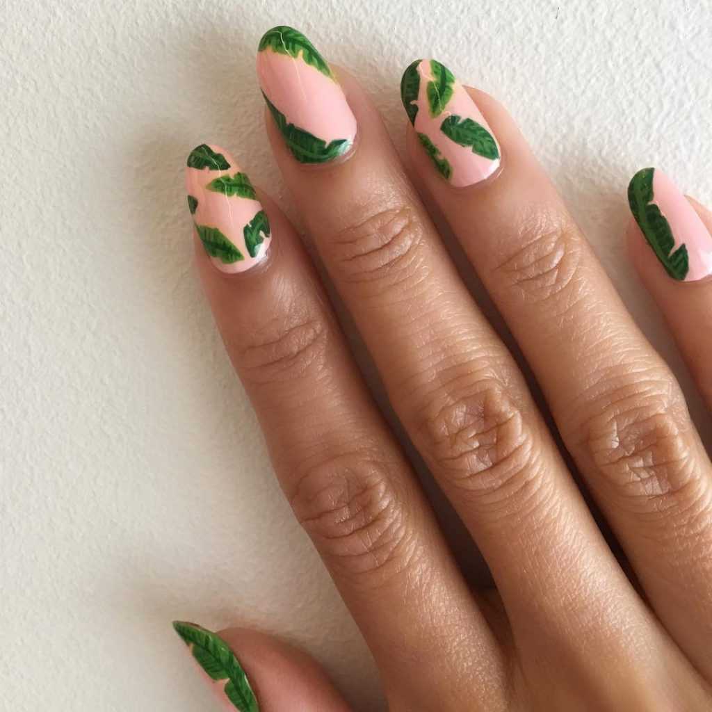 Отпускной маникюр станет поистине шикарным, если украсить поверхность ногтей яркой тропической зеленью. При работе лучше использовать стойкие гелевые покрытия, чтобы радоваться тропическим рисункам весь отпуск.