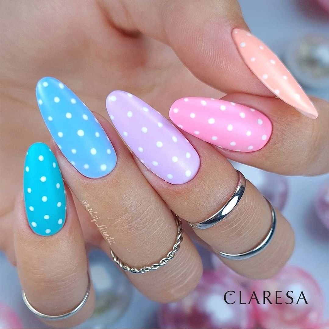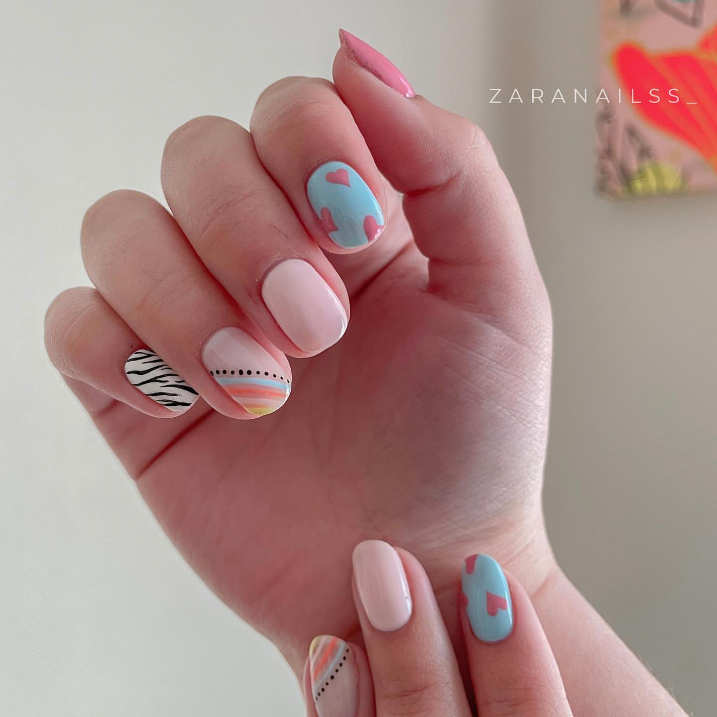 Отличным вариантом будет сделать в летнее время года радужный маникюр, окрасив каждый ноготь в новый контрастный цвет. Для выполнения этого дизайна можно взять следующие цвета: