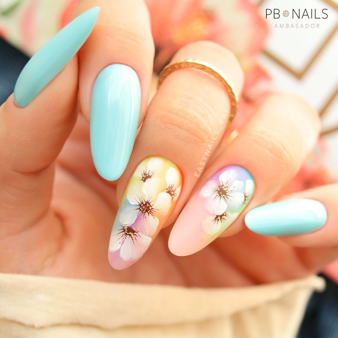 Особой нежностью на руках обладает эффект градиента. В основном используют светлые оттенки. Аккуратно исполненная растяжка добавляет рукам настоящую утонченность. Этот вариант отлично дополняют тонкими веточками, цветами, фольгой или блеском.
