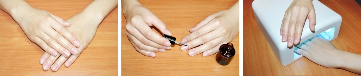 Сначала покрытие шеллак наносится на пальцы одной руки (помимо большого), а затем по той же схеме на вторую руку. По завершении обработки обеих кистей мастер возвращается к большим пальцам.