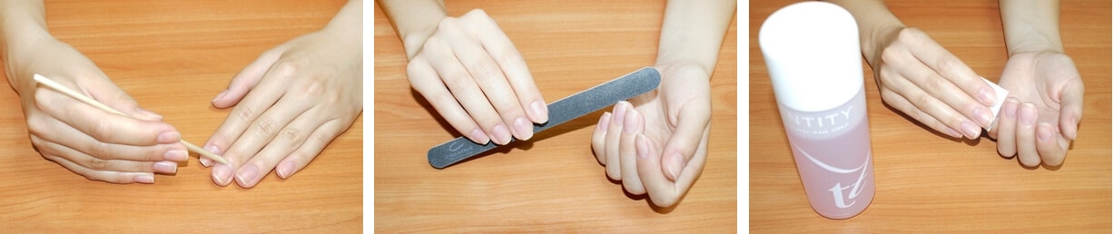 Сначала убирают старый лак или покрытие, и смягчают кутикулу специальным маслом. Удаляют этот кожный валик, используя щипчики для обрезания или апельсиновую палочку для отодвигания. Основание ногтя требуется тщательно зачистить, чтобы лак не отслаивался. Заканчивается этот этап мытьём рук с использованием мыла и обработкой ранок, если появились.