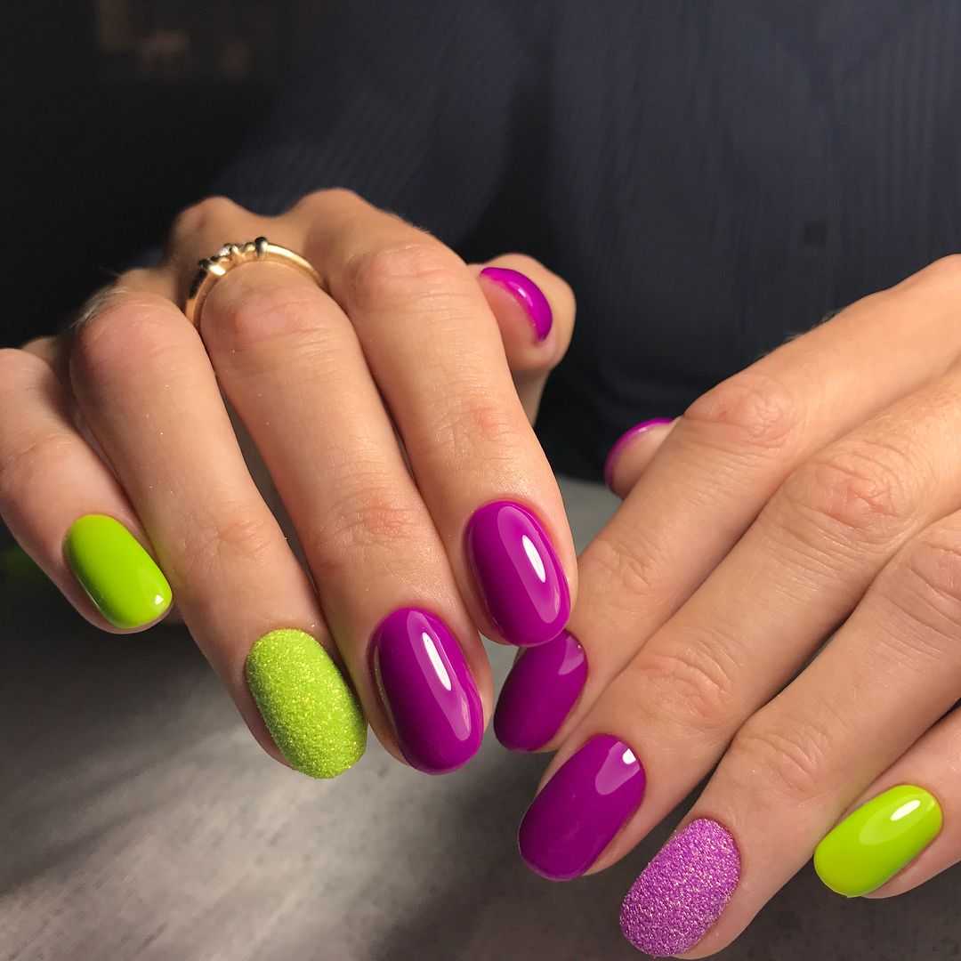 Яркость и совершенство фиолетового отлично подчёркивается жёлтым. Красный или коралловый чудесно сочетается с бирюзовым или зелёным. К этому определению также можно уверенно отнести сочетание в одном маникюре различных структур, где матовые, лаковые и перламутровые покрытия прекрасно гармонируют между собой в одном дизайне.