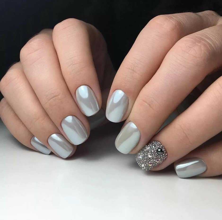 Если не хочется привлекать к себе излишнее внимание, можно сделать красивый маникюр в серых цветах, покрыв серебристым только ногти на средних и безымянных пальцах, а остальные — спокойным матовым цветом