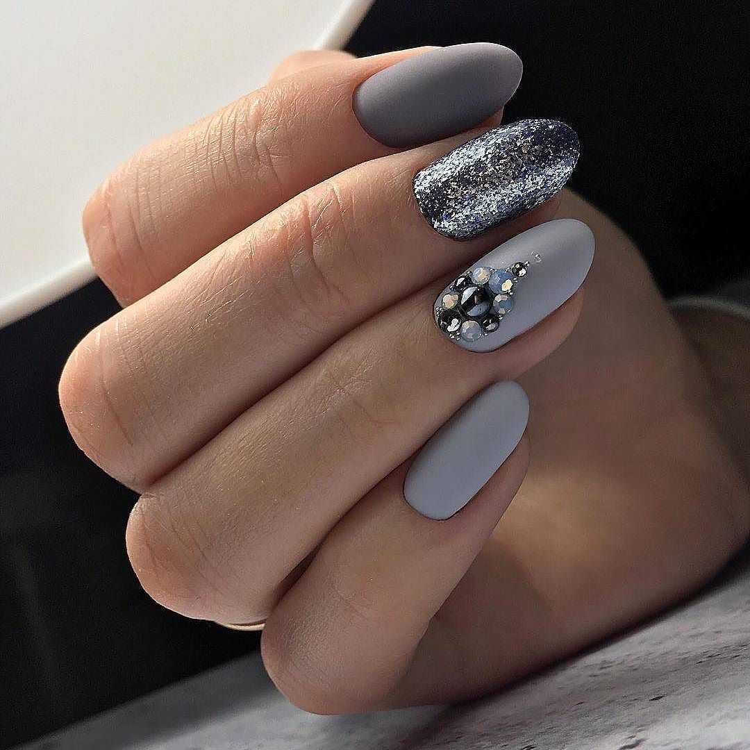 Матовый серый маникюр выглядит очень стильно и оригинально даже в чистом виде, если подобрать красивый оттенок. Часто матовый дизайн смешивают с глянцем, создавая тем самым комбинированный маникюр. А чтобы облагородить и разнообразить дизайн на серые матовые ногти наносят объемный рисунок, присыпают мерцающей пудрой или украшают бисером, блестками и стразами.