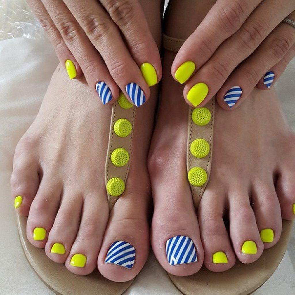 Еще одна классика — морской стиль возвращается к нам летом 2023 года. Стандартные синие, голубые, белые и красные полоски будут украшать ноготки на руках и ногах. Морская тематика позволяет использовать разные рисунки, которые касаются моря.