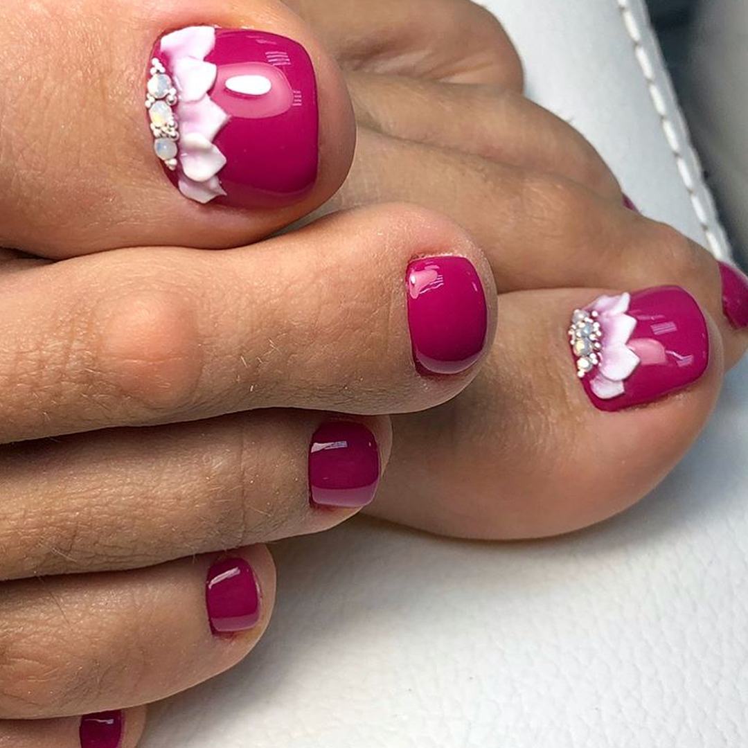 - Очень стильным вариантом такого педикюра станет дизайн с изображением объемных цветов, декорированных стразами.