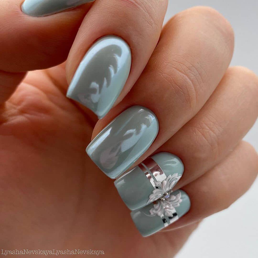 - фольга – используйте оттиск маникюрной фольгой: голубой, золотой, голографической и другими оттенкам, по краю ногтевой пластины или в прикорневой зоне