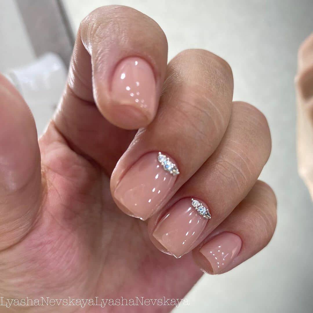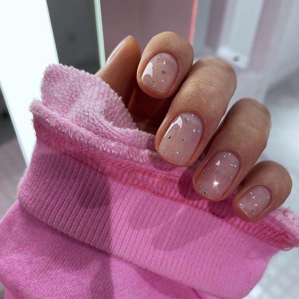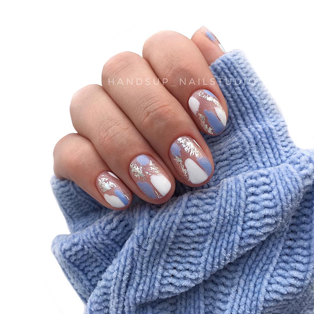 Зимний нюдовый маникюр 2022 на короткие овальные ногти — это, прежде всего, блестки, омбре (поможет визуально “вытянуть” ноготь, если есть такая потребность), фольга.
