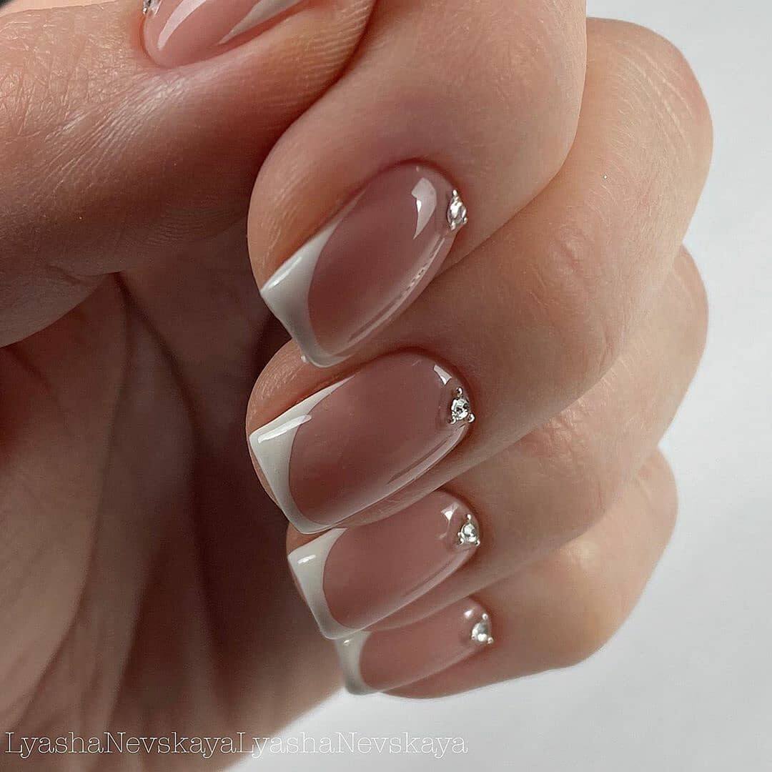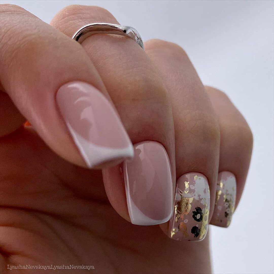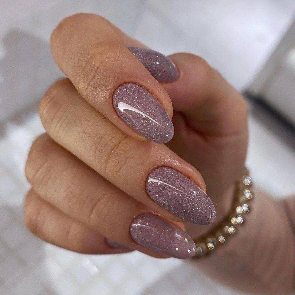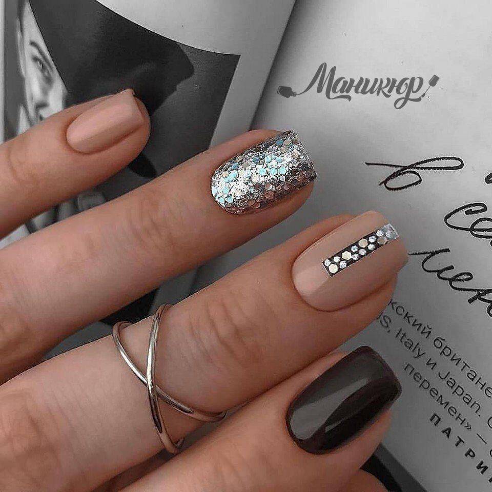 Зимний нюдовый маникюр 2022 на короткие овальные ногти — это, прежде всего, блестки, омбре (поможет визуально “вытянуть” ноготь, если есть такая потребность), фольга.