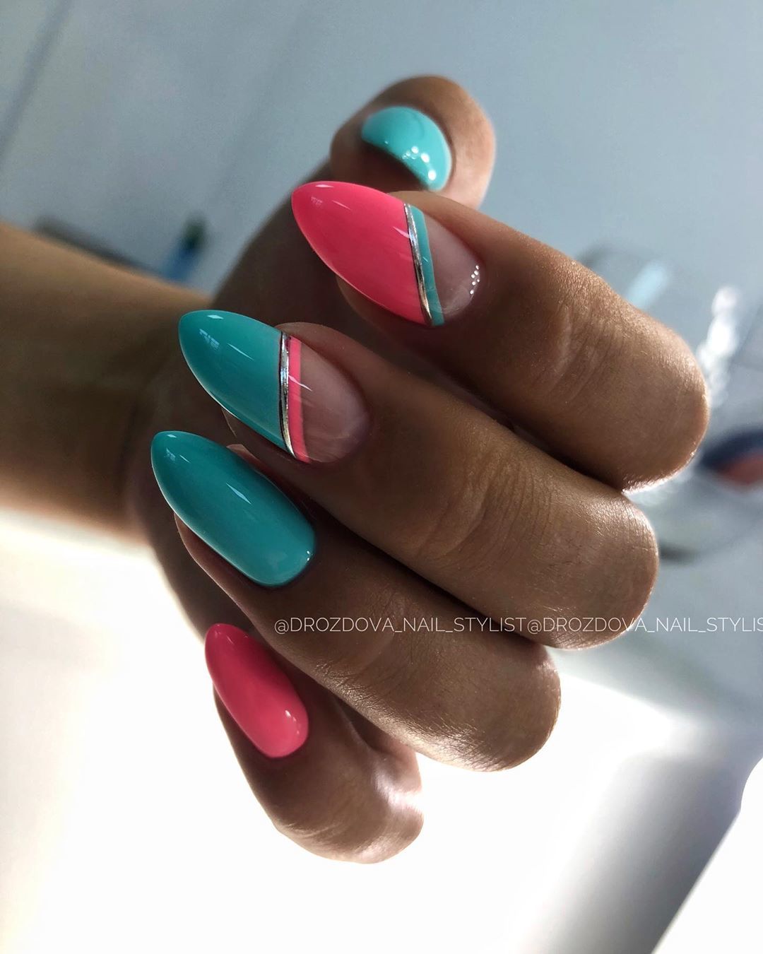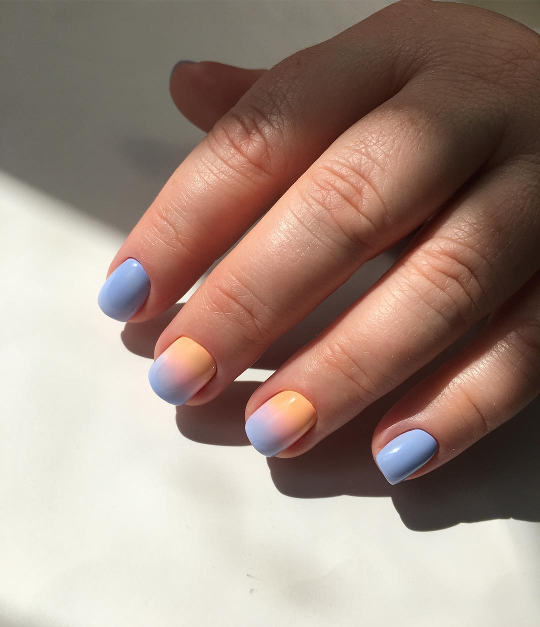 Самые трендовые “компаньоны” нюда в летнем маникюре — голубой, розовый, синий, оранжевый, желтый.