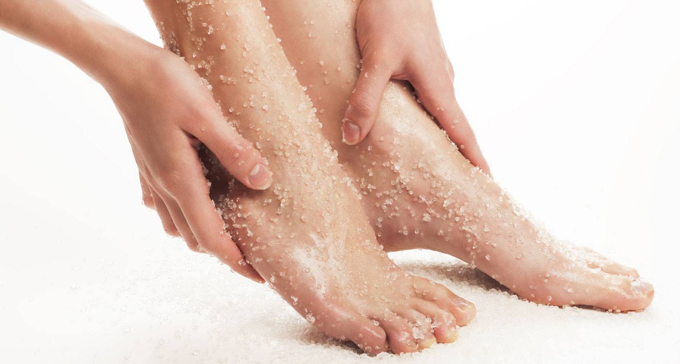 - Во-вторых, чистые ножки следует обработать скрабом или пемзой, дабы удалить с них отмершие клетки кожи. Все эти действия помогут нам максимизировать эффект от маски.