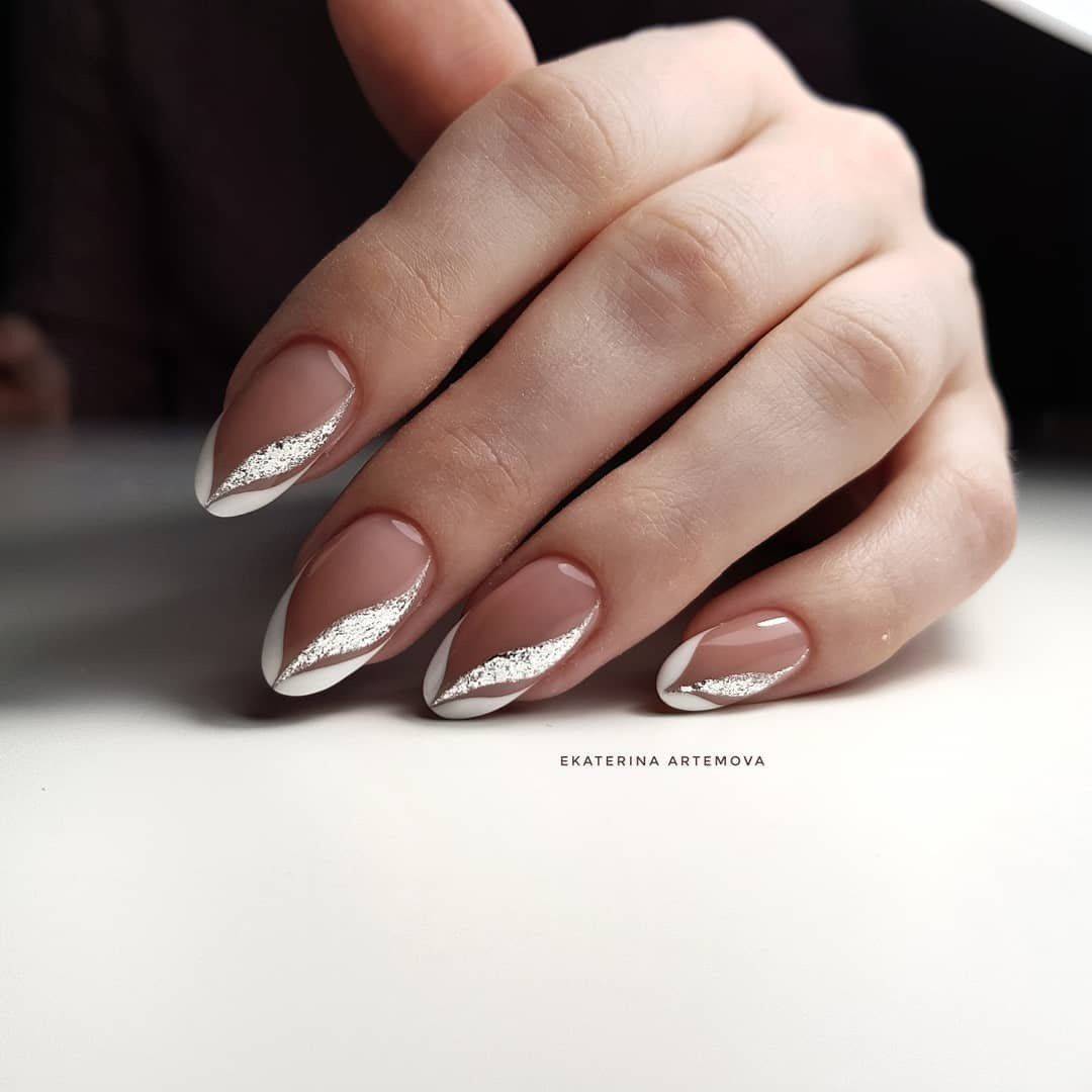 Серебряные детали на молочной базе смотрятся стильно. При создании дизайна лучше ограничиться простыми геометрическими линиями или полностью окрасить безымянный палец серебристым.