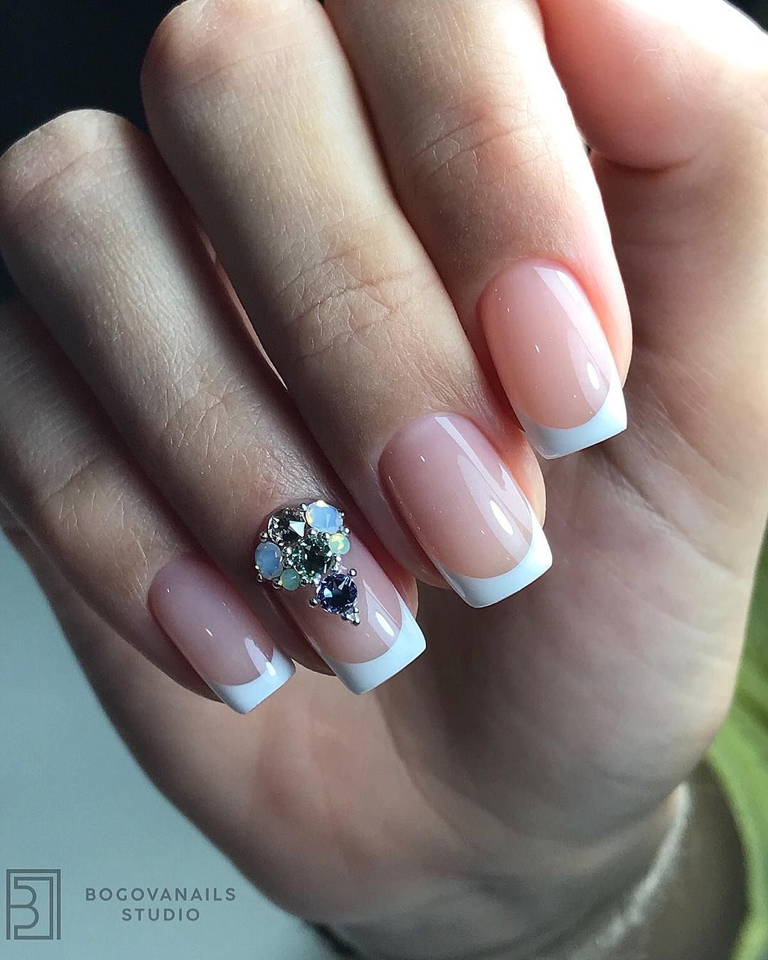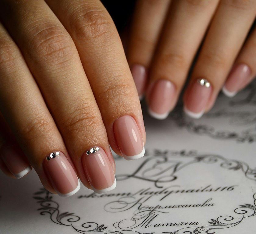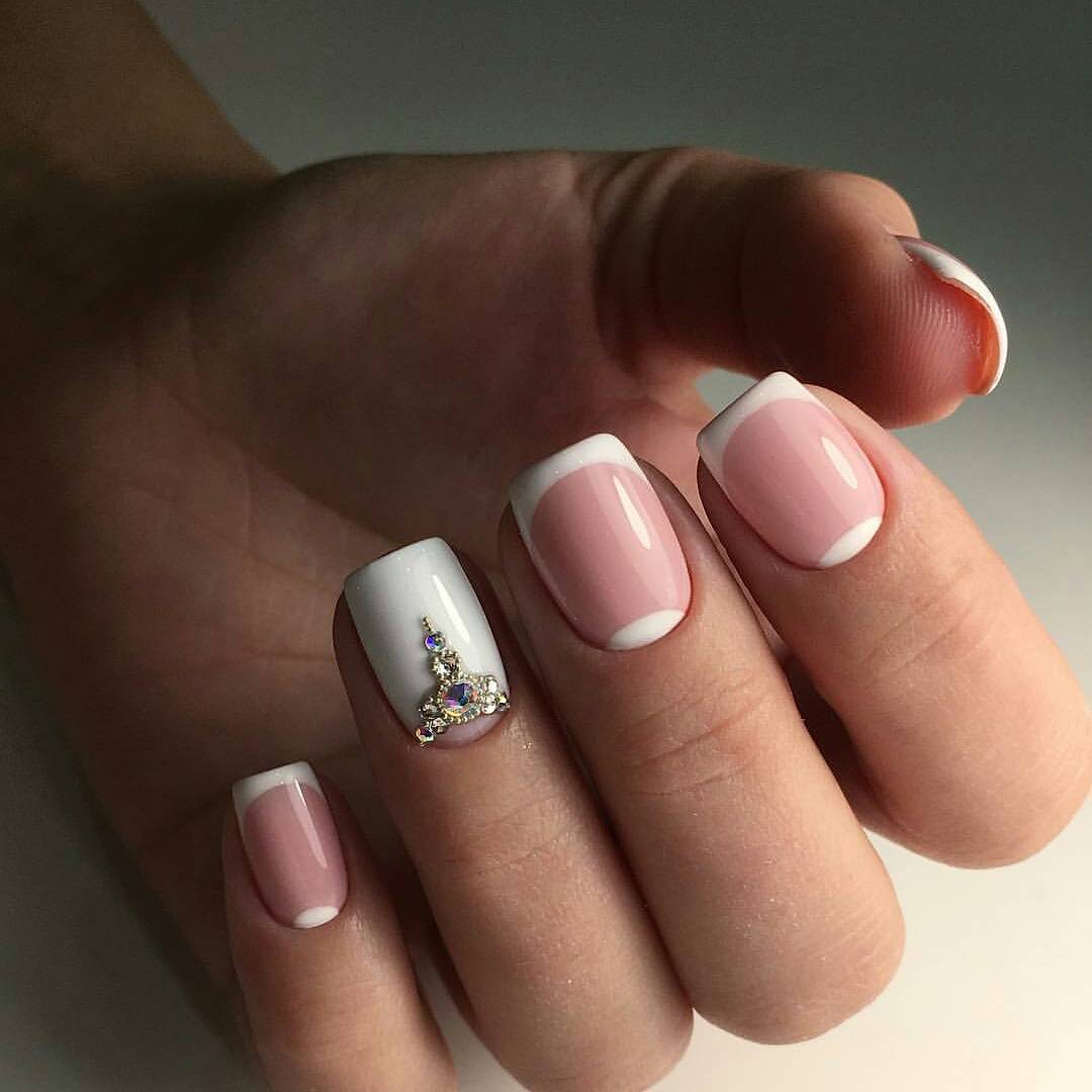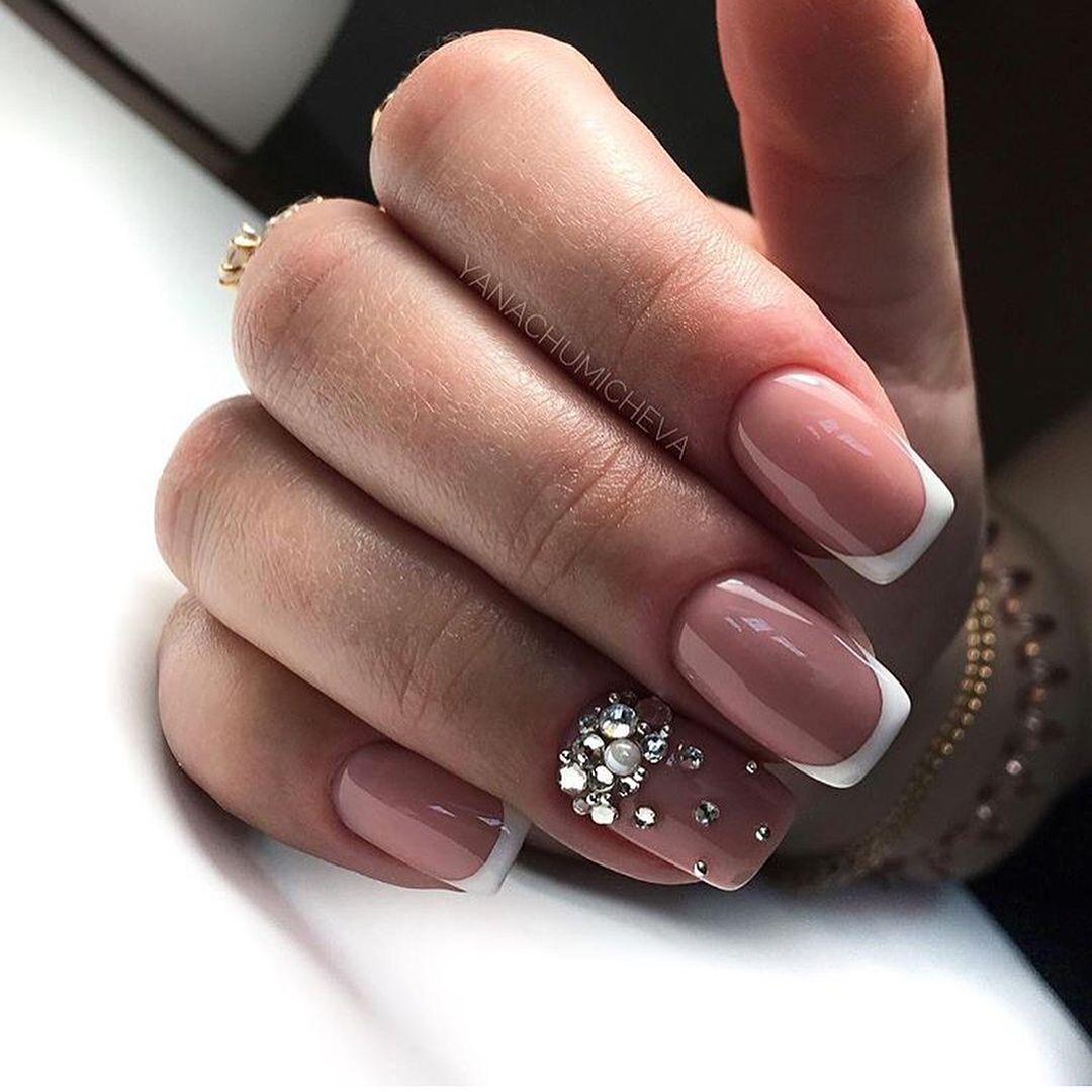 Добавление страз на безымянный палец добавит изюминку в простой маникюр. Желательно использовать стразы кристального или опалового цвета.