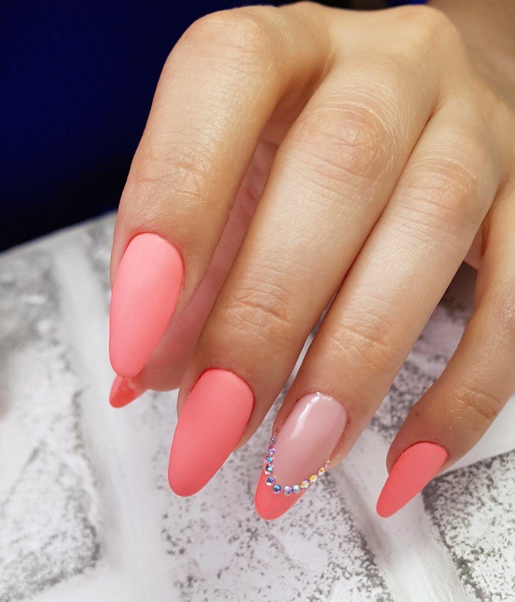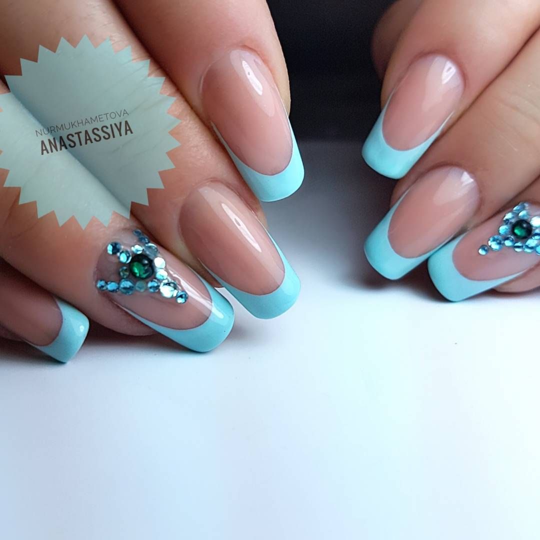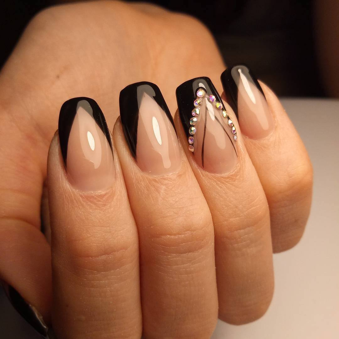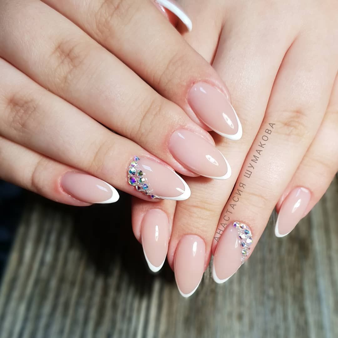 Добавление страз на безымянный палец добавит изюминку в простой маникюр. Желательно использовать стразы кристального или опалового цвета.