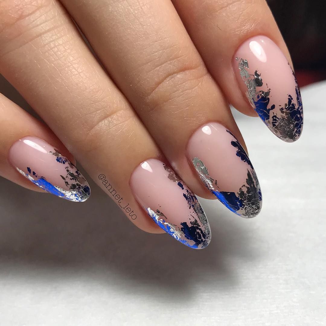 Кроме этого любой из выбранных вами блестящих фрагментов, будь то фольга, глиттер либо камифубуки, будет невероятно красиво смотреться в тандеме с нюдовой основой. Реализовать подобные идеи можно в виде выделения лунулы у основания ногтевых пластин при помощи глиттера либо использования сверкающих частиц для преображения рисунка. Также, как вариант, можно создавать из сверкающих деталей красивые узоры и композиции либо применять частицы для полного покрытия акцентных ноготков.