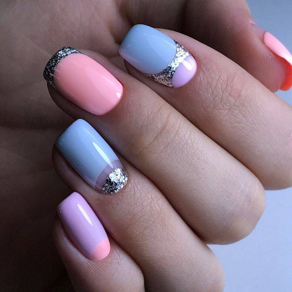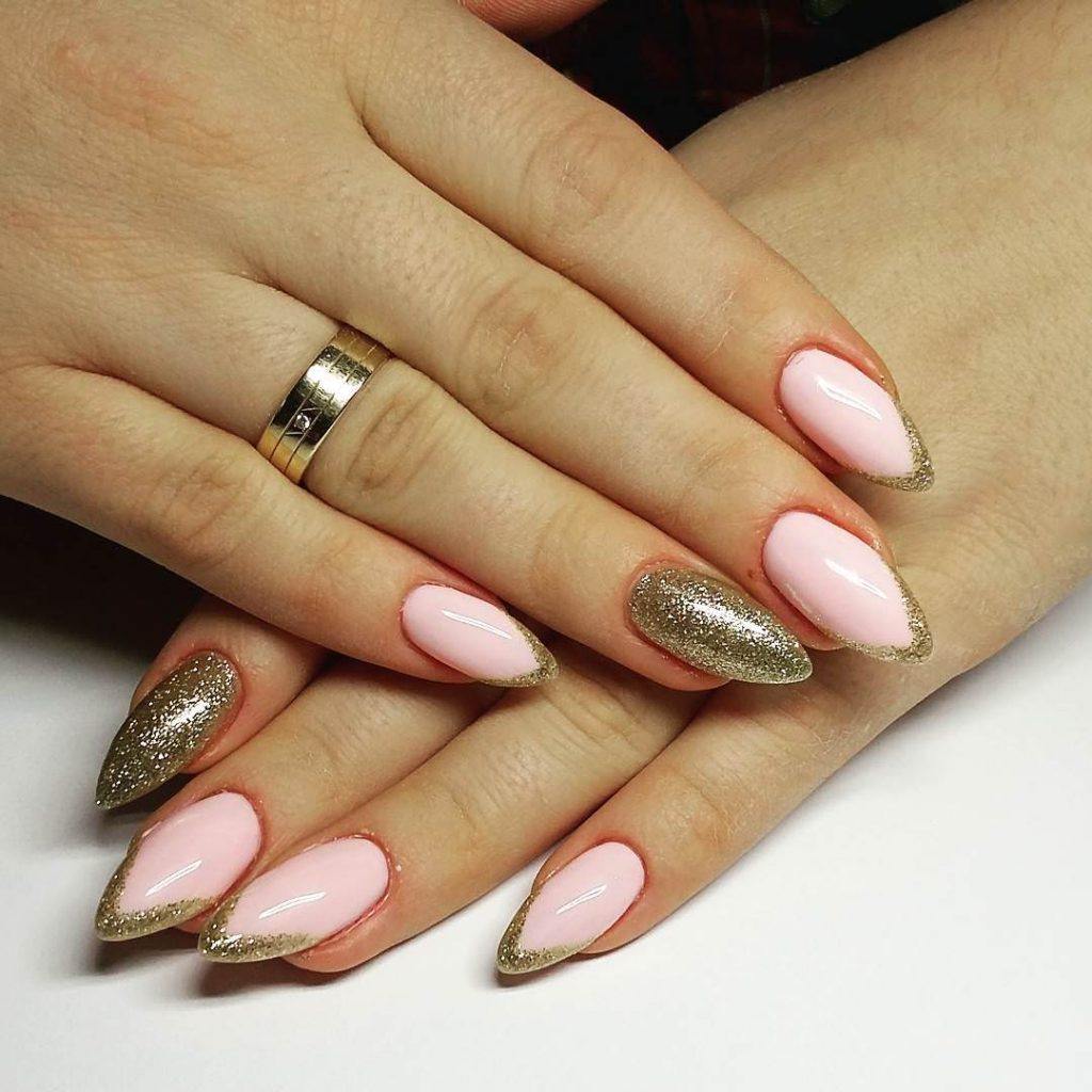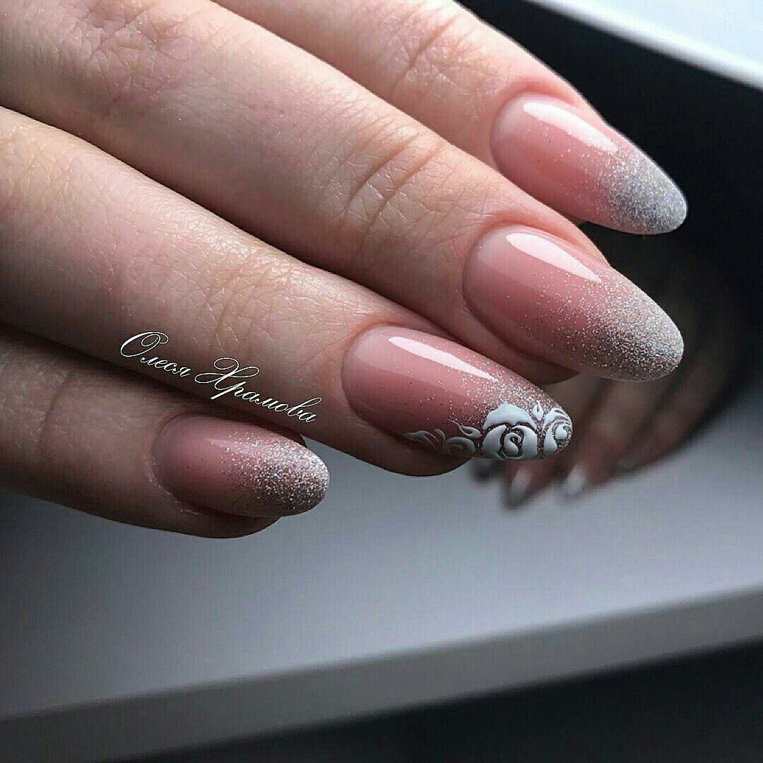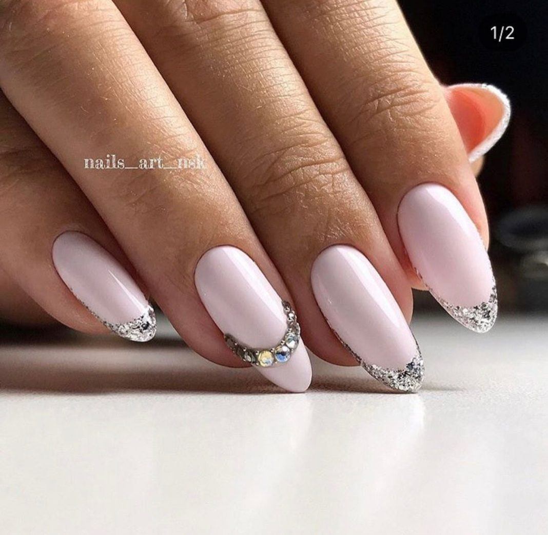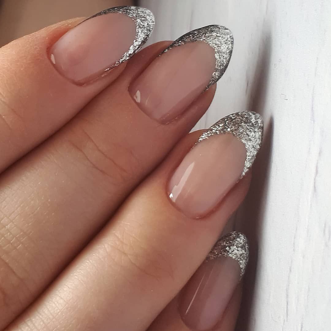 Френч или омбре с блёстками на концах менее привередлив и дольше сохраняет свежий вид. Для холодной молочной базы следует выбирать серебристые блёстки, для теплой – золотистые. Шиммер придаст маникюру жемчужную красоту, а также скроет неровности ногтевой пластины.