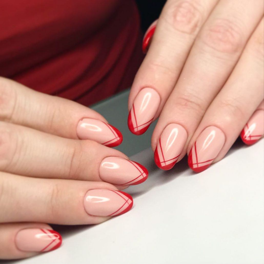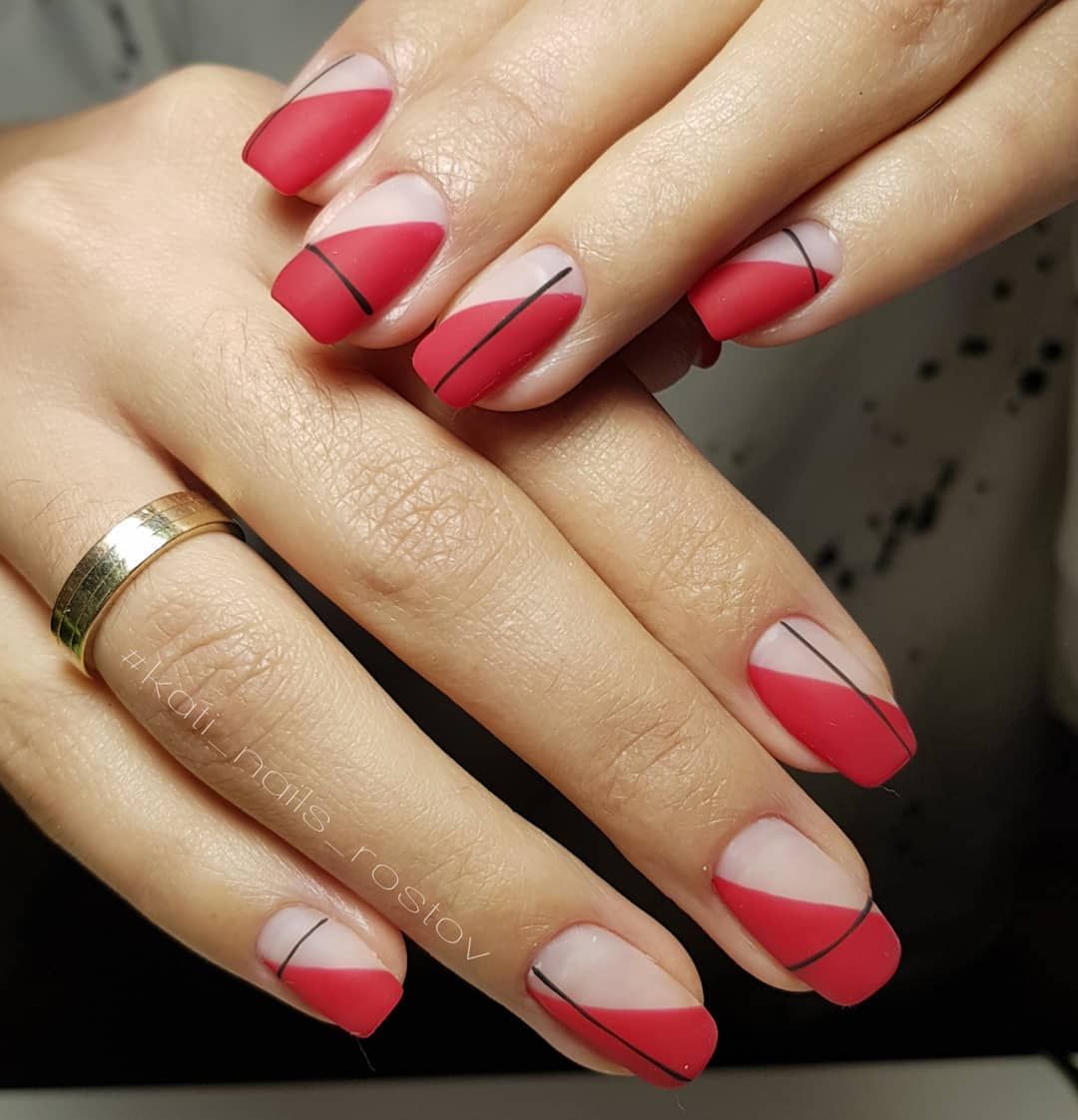 Контраст спокойного молочного цвета с красным создаёт яркий образ. Для благородного образа подойдут алые и вишневые оттенки в дизайне. Новогодний маникюр можно закончить матовым финишем и стразами.
