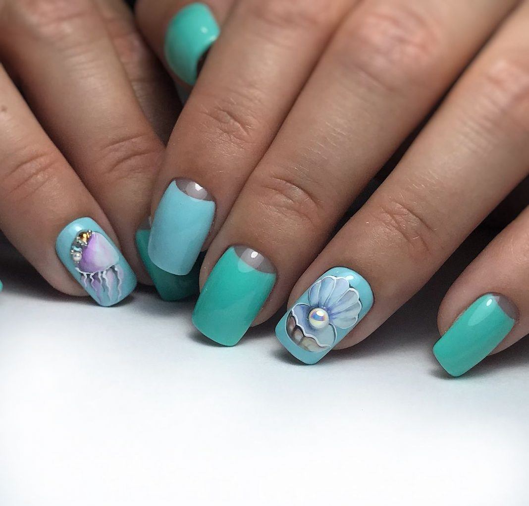 Молочный раскрывает благородство и роскошь изумрудного цвета. Матовая текстура, мрамор, битое стекло, золотистая фольга – эти техники сделают дизайн объемным и дорогим.