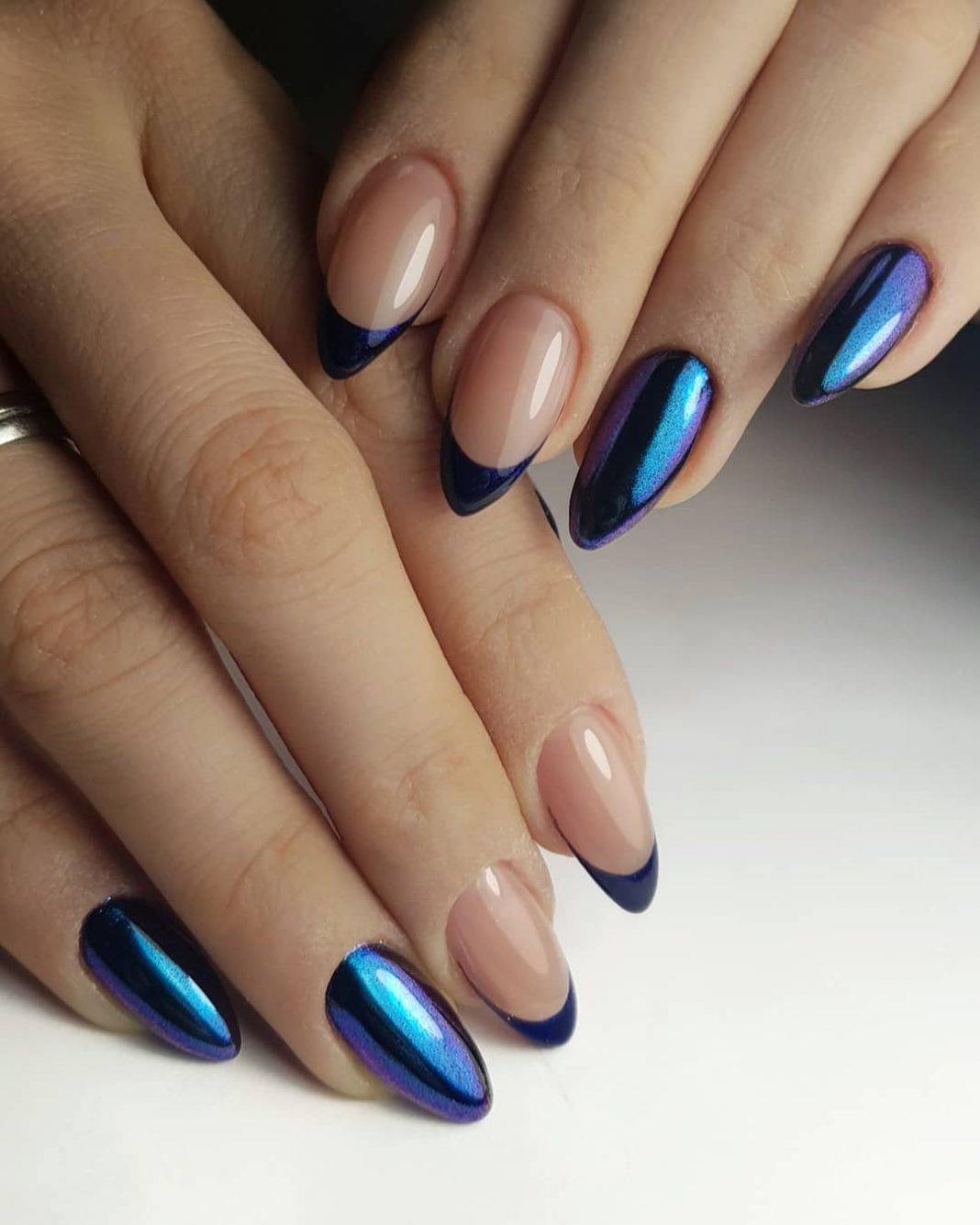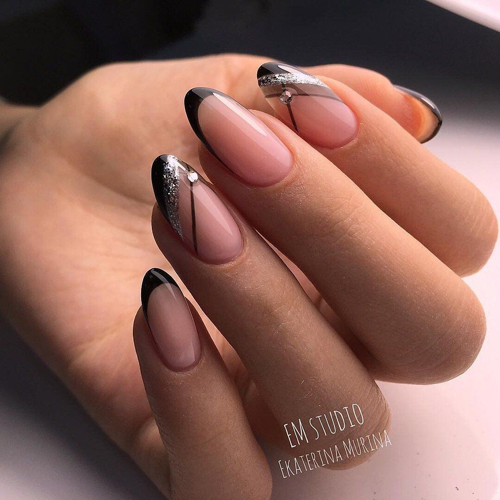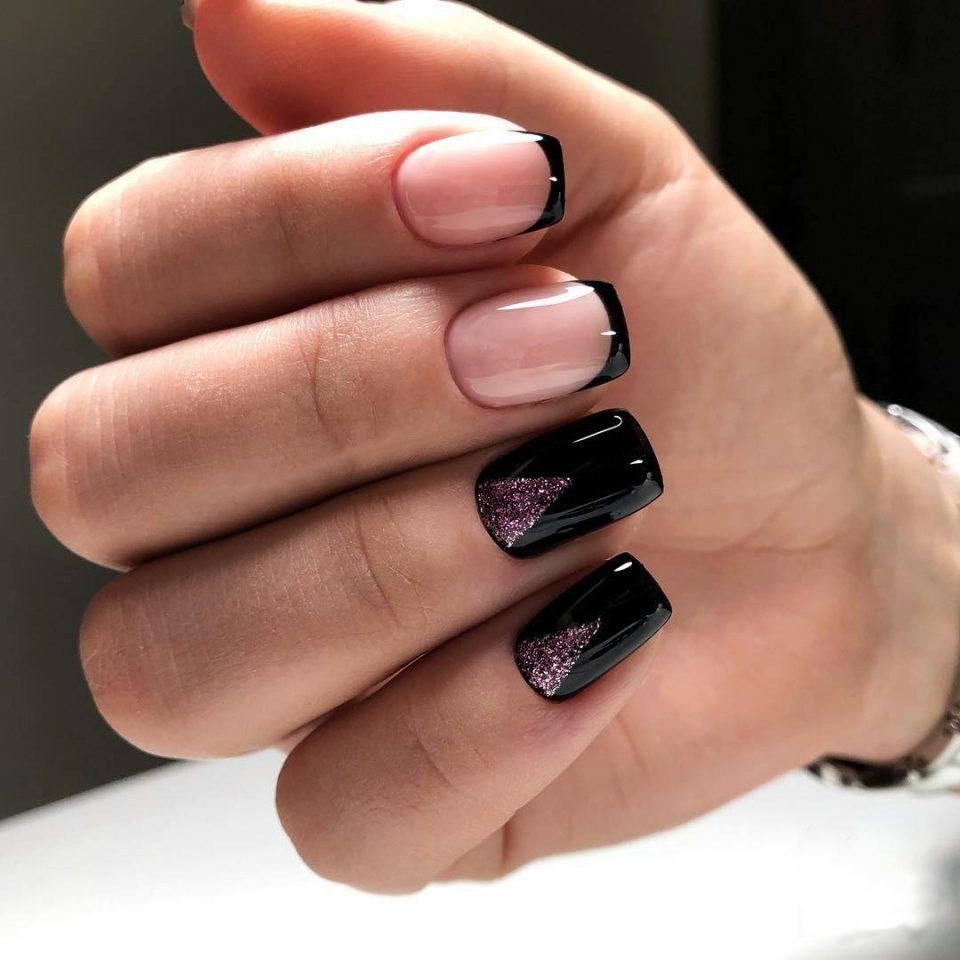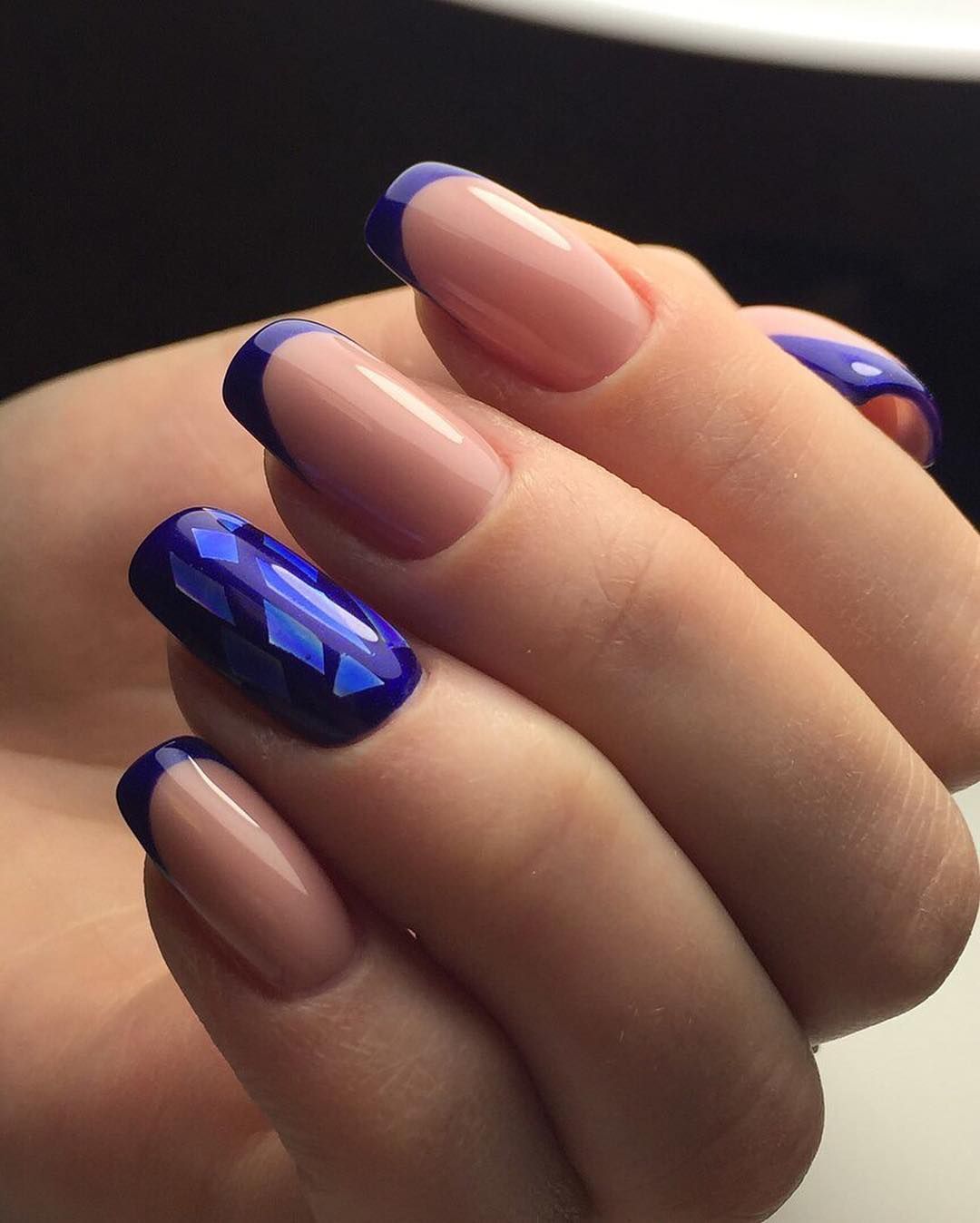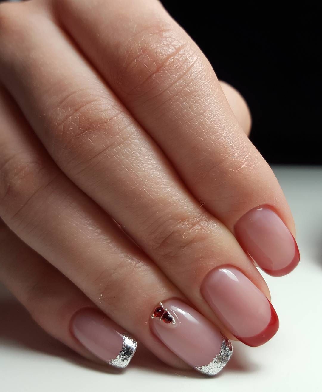 Блестящий френч – хит этого года. Полоски или чередование с полностью блестящими ногтями сделают дизайн праздничным.
