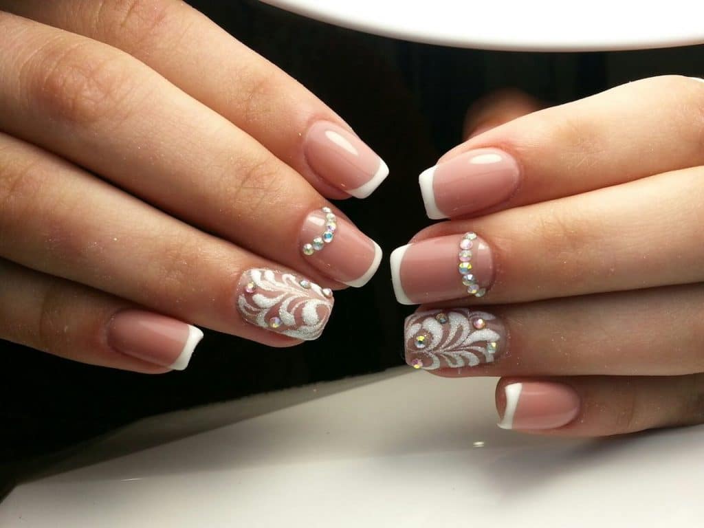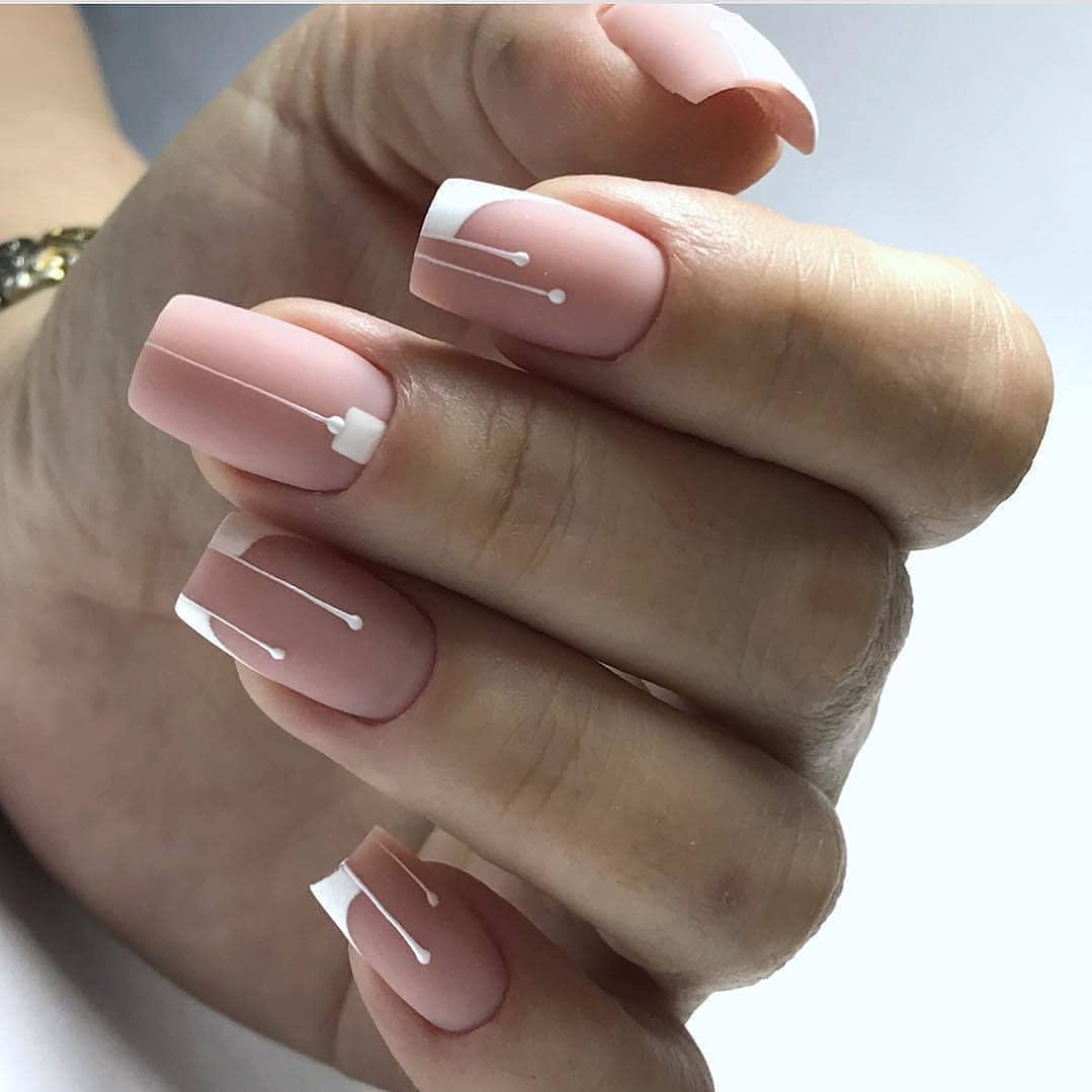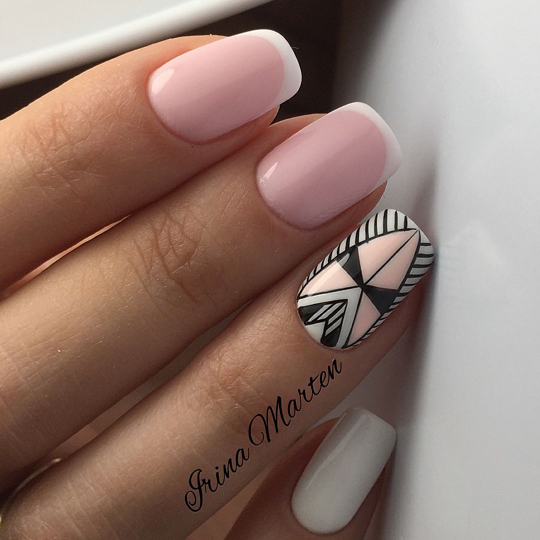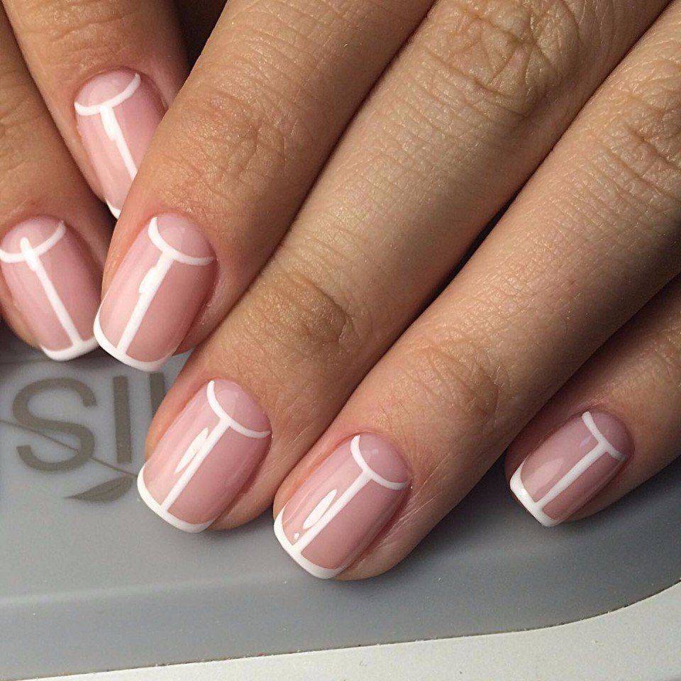 Классический вариант — белый френч на прозрачной базе. Оригинальным вариантом станут белые геометрические узоры, стемпинг.