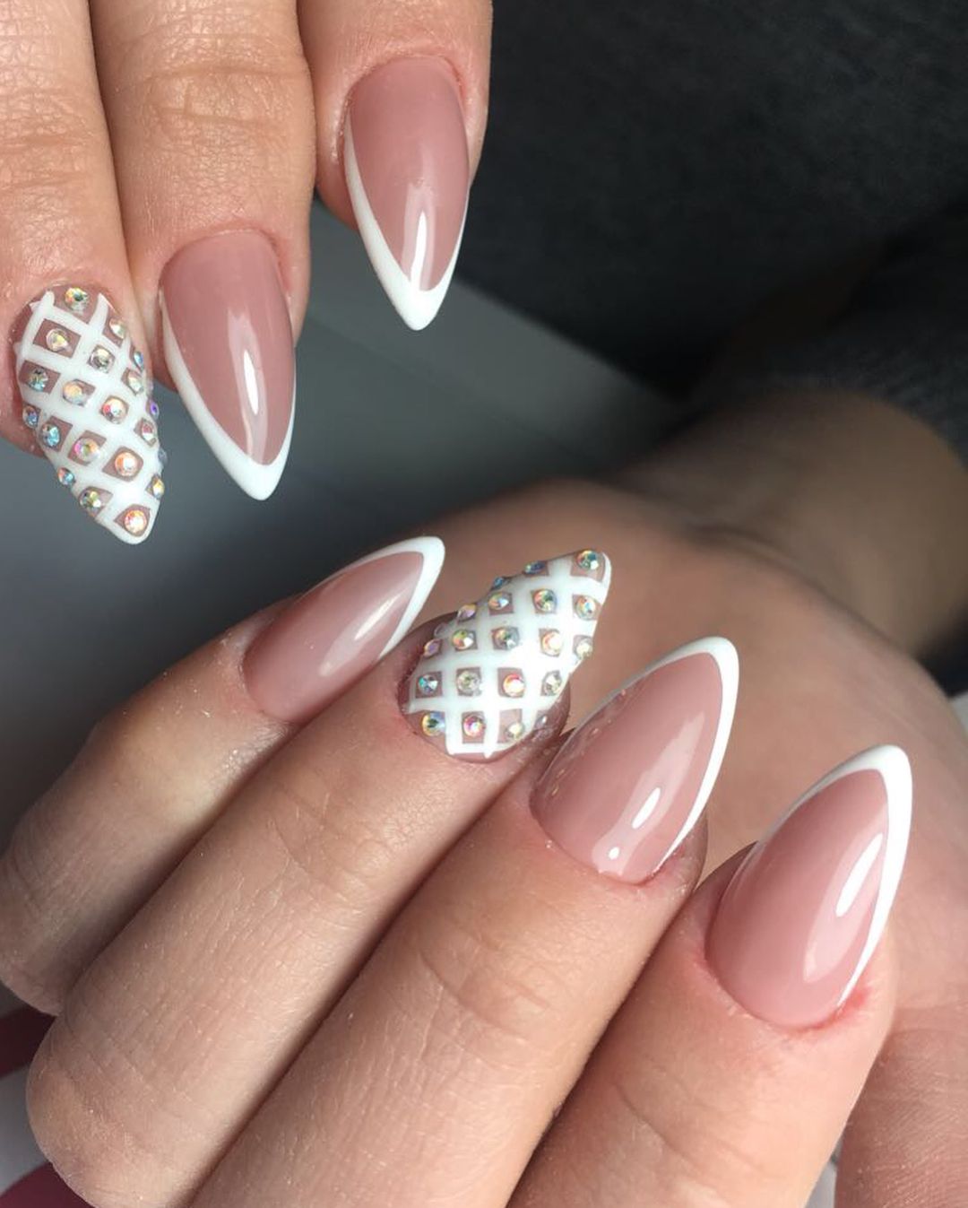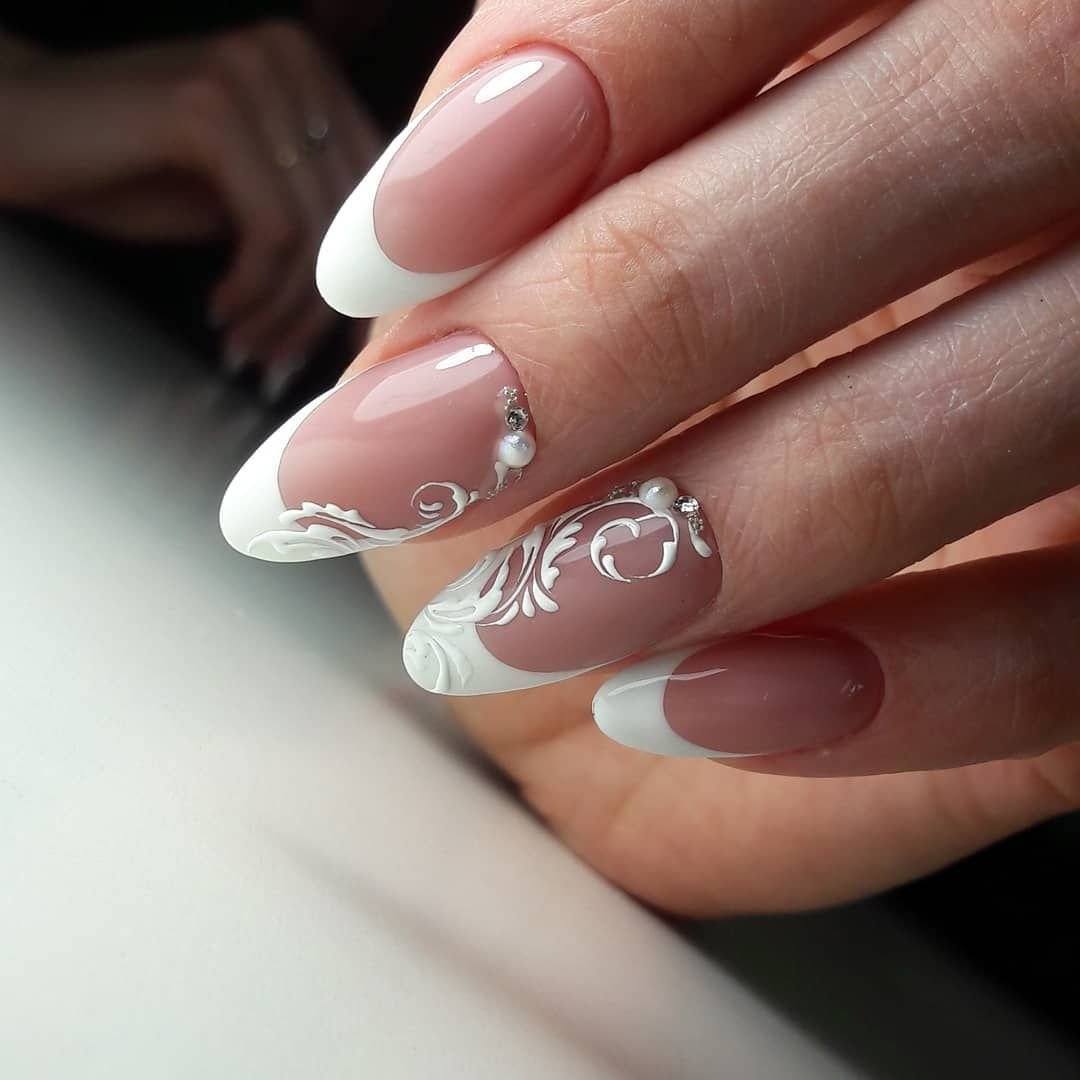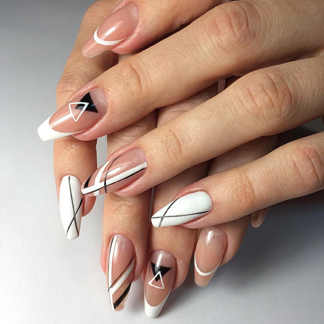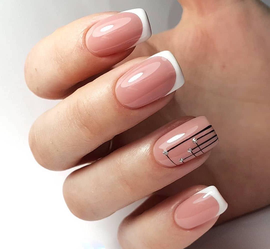 Классический вариант — белый френч на прозрачной базе. Оригинальным вариантом станут белые геометрические узоры, стемпинг.
