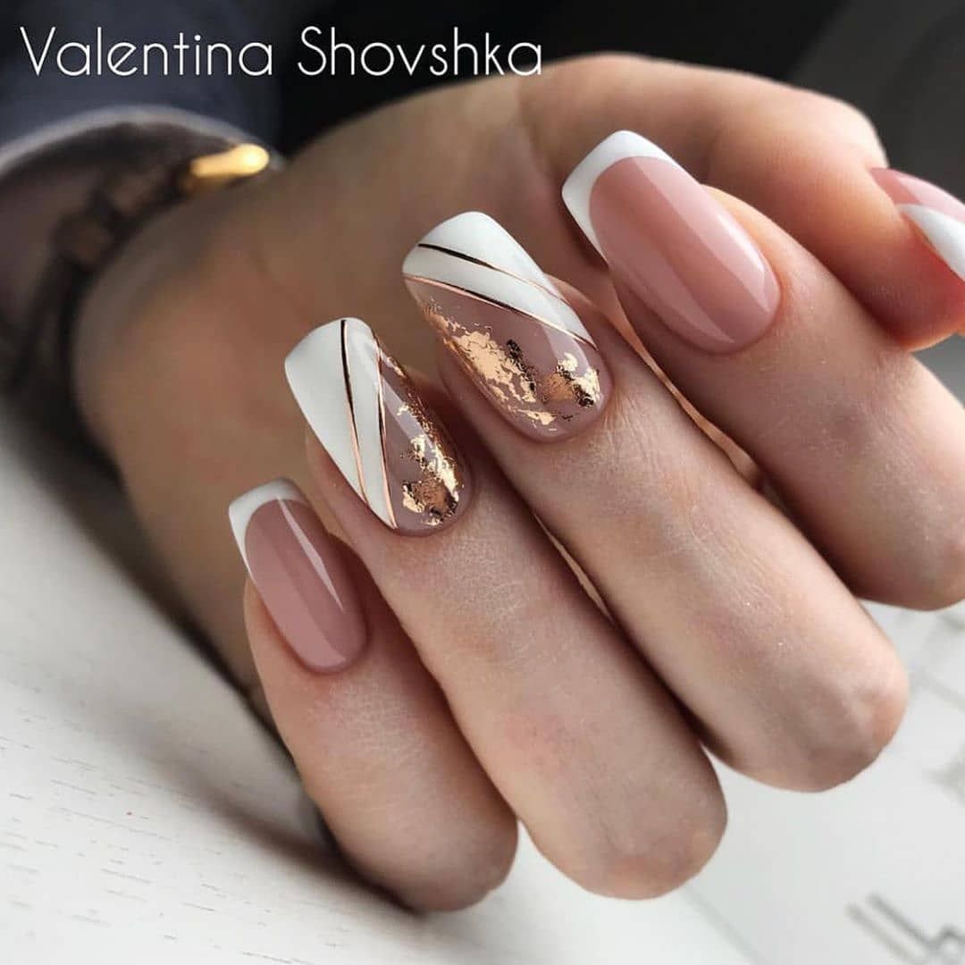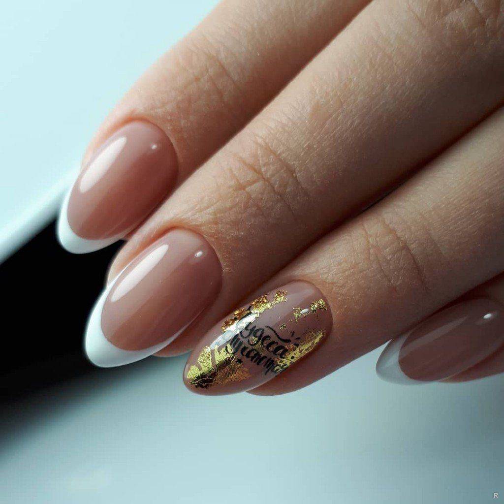 Молочно-бежевый маникюр — базовый. Для изюминки можно добавить золотистую или серебристую фольгу, камифубуки, стразы. Так как оттенки тёплые лучше отдать предпочтение золоту.