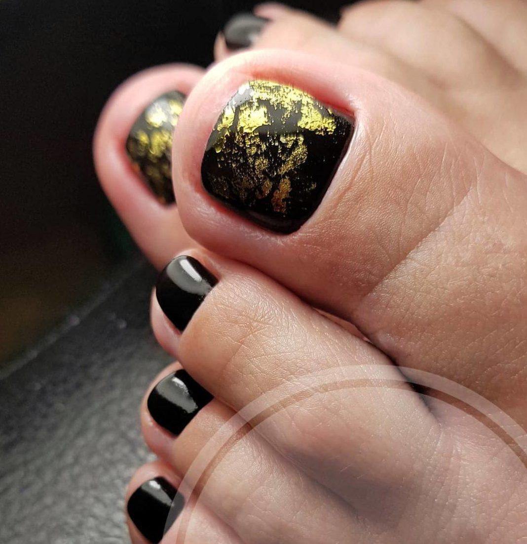Среди дизайнов педикюра с фольгой можно найти множество стильных и нестандартных решений. Напомним, позолота в тренде, поэтому самое подходящее украшение ногтей в этом случае – фольга.