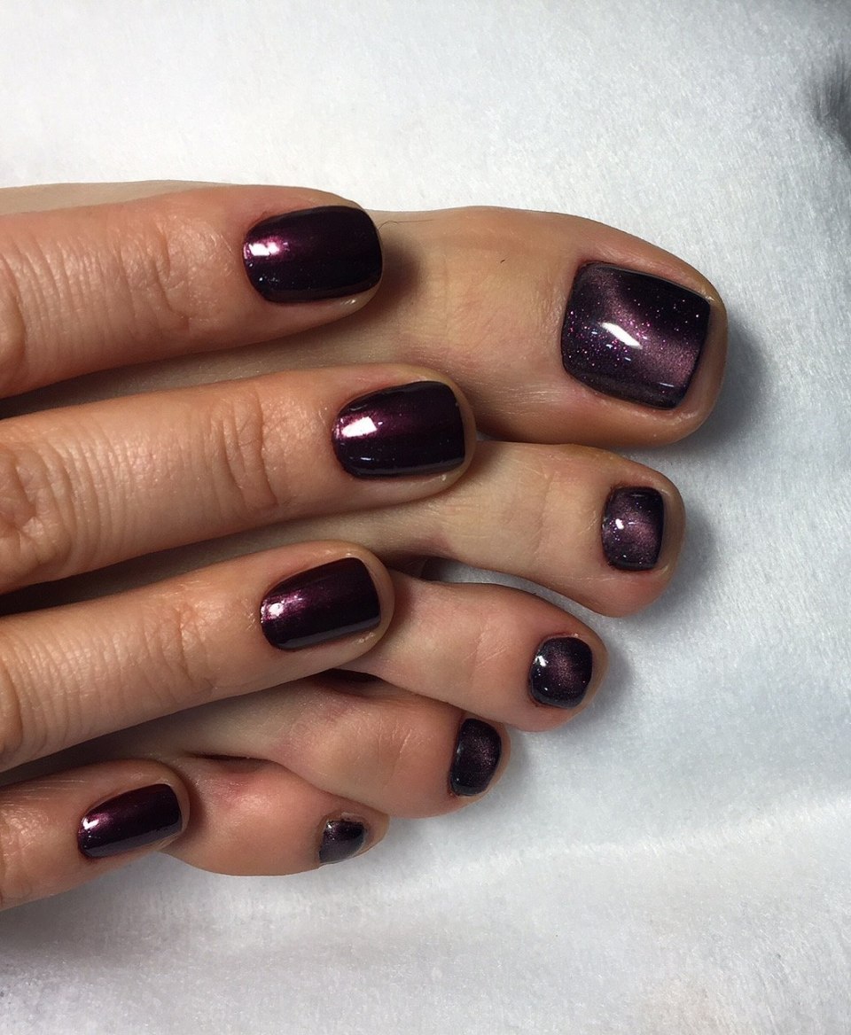 Чарующие оттенки дизайна »Кошачий глаз» не оставят равнодушными вас зимой 2022 года. А особенно прекрасно будет смотреться зимний педикюр в тёмных цветах. Придавая вашим ноготкам, завораживающее сияние различных оттенков.