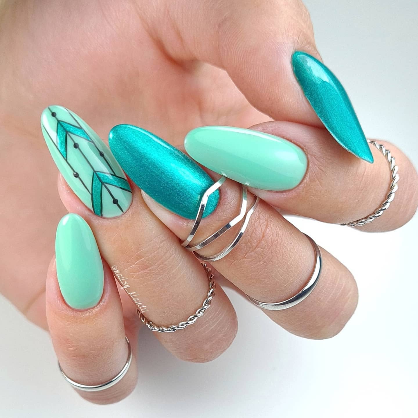 9. Мятная свежесть: Освежающий и свежий мятный оттенок в сочетании с пурпурным создаст нежный и стильный маникюр весеннего образа. Этот дизайн подойдет для повседневного использования.