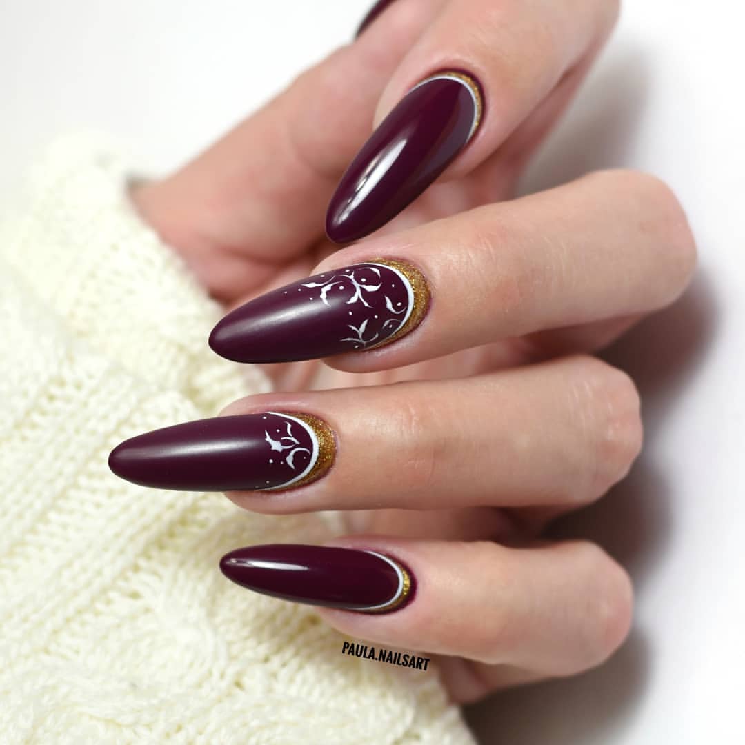 2. Золотой гламур: Сочетание золотого блеска и пурпурного оттенка создаст эффектный и роскошный образ. Этот маникюр подойдет для особых мероприятий и праздников.
