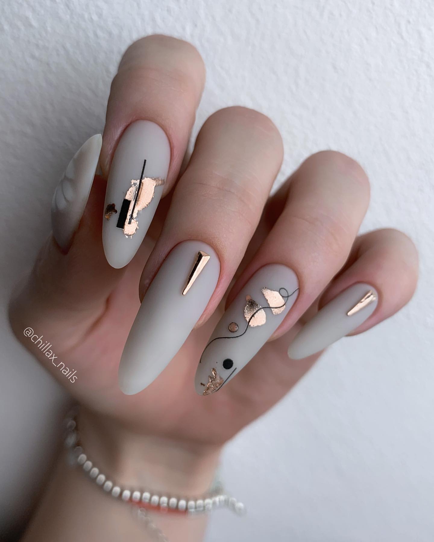 Предпочтение отдается заостренному дизайну в серебристых и золотистых тона, они идеально описывают осеннее время года. Предпочтение заостренному дизайну объясняется удобством, такие ногти имеют меньший риск зацепиться за что-либо.