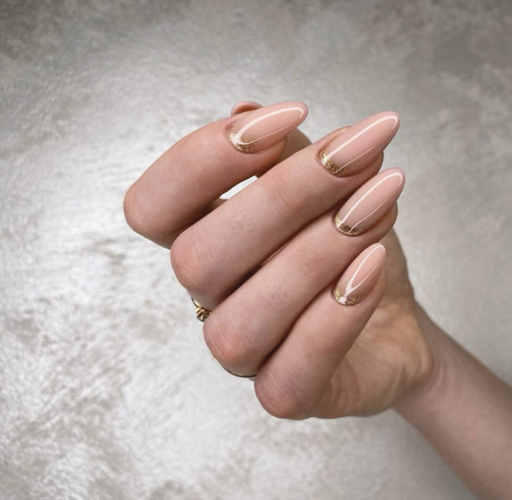 нюдовое покрытие с минималистичными украшениями из металла на указательном и среднем пальцах;