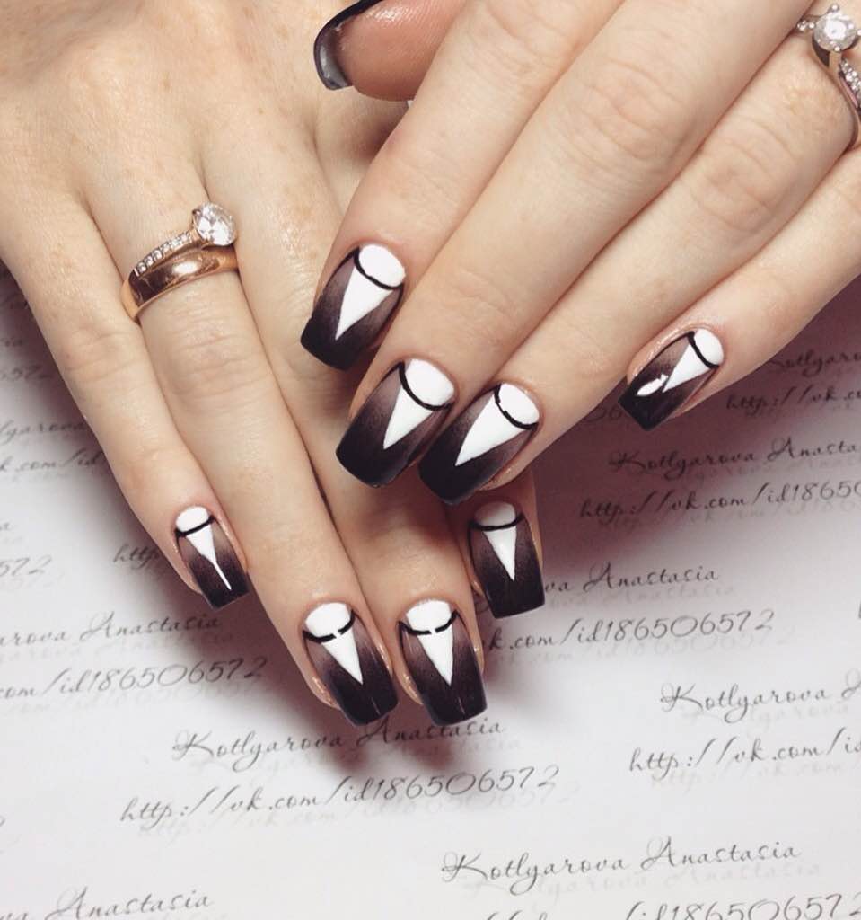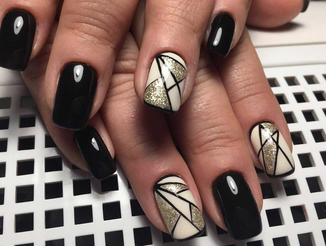 Отлично сочетается с белым, бежевым, серым, серебристым (тоже хороший вариант для абстрактной композиции). Дизайн с использованием черного цвета отлично подойдет к стильному вечернему платью, в целом, такой маникюр универсальный.