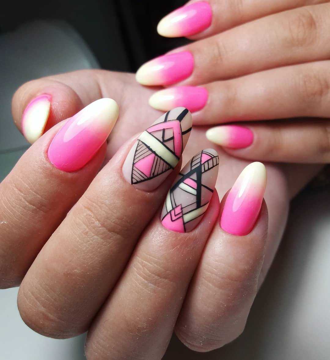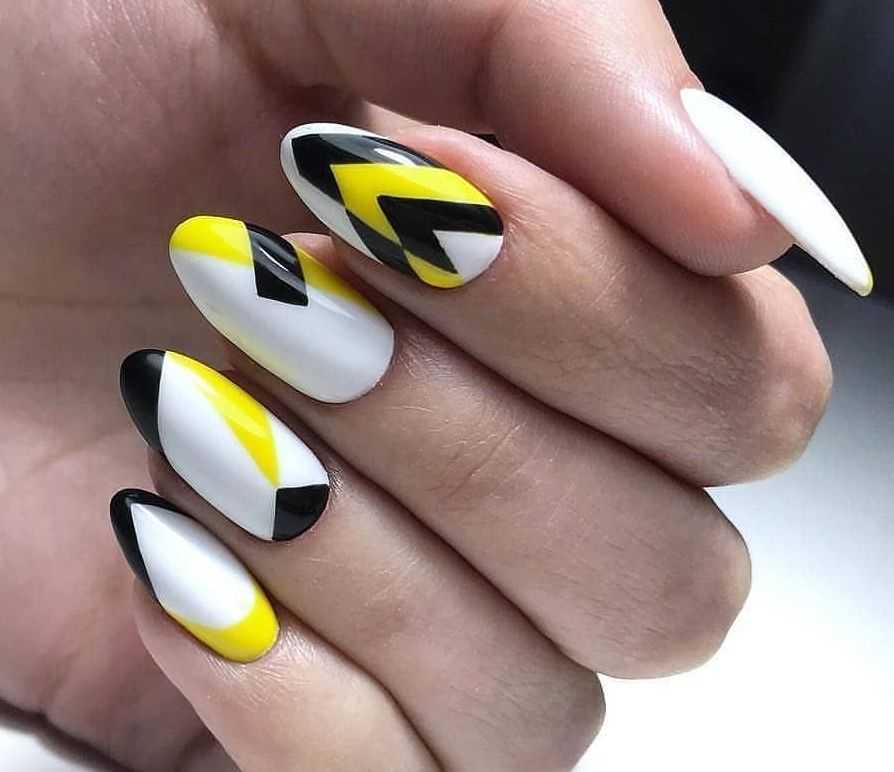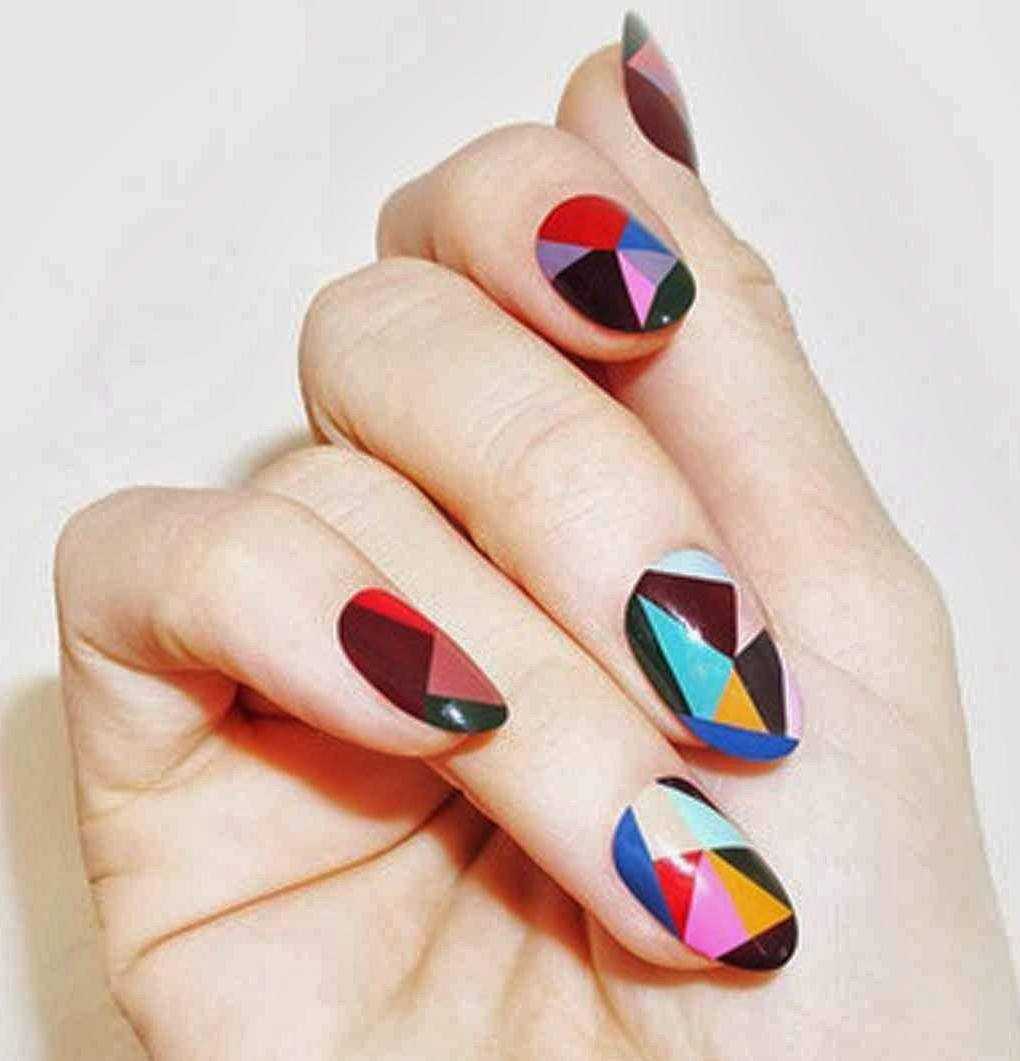 Ногти в стиле геометрии в любом случае смотрятся красиво. Для создания эффектного маникюра используют лаки разных цветов.