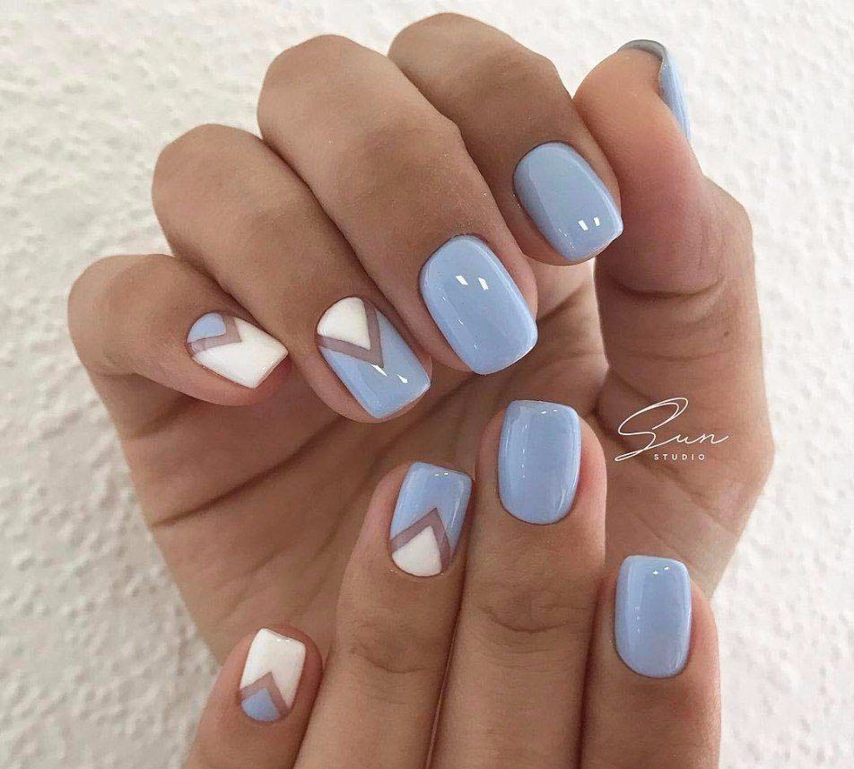 Белый цвет отлично сочетается с голубым, розовым, фиолетовым, серым, серебристым. Маникюр может быть выполнен в контрастных тонах или с сочетанием оттенков схожего цвета.
