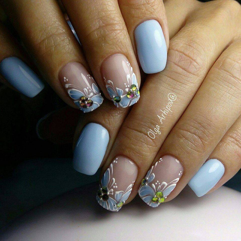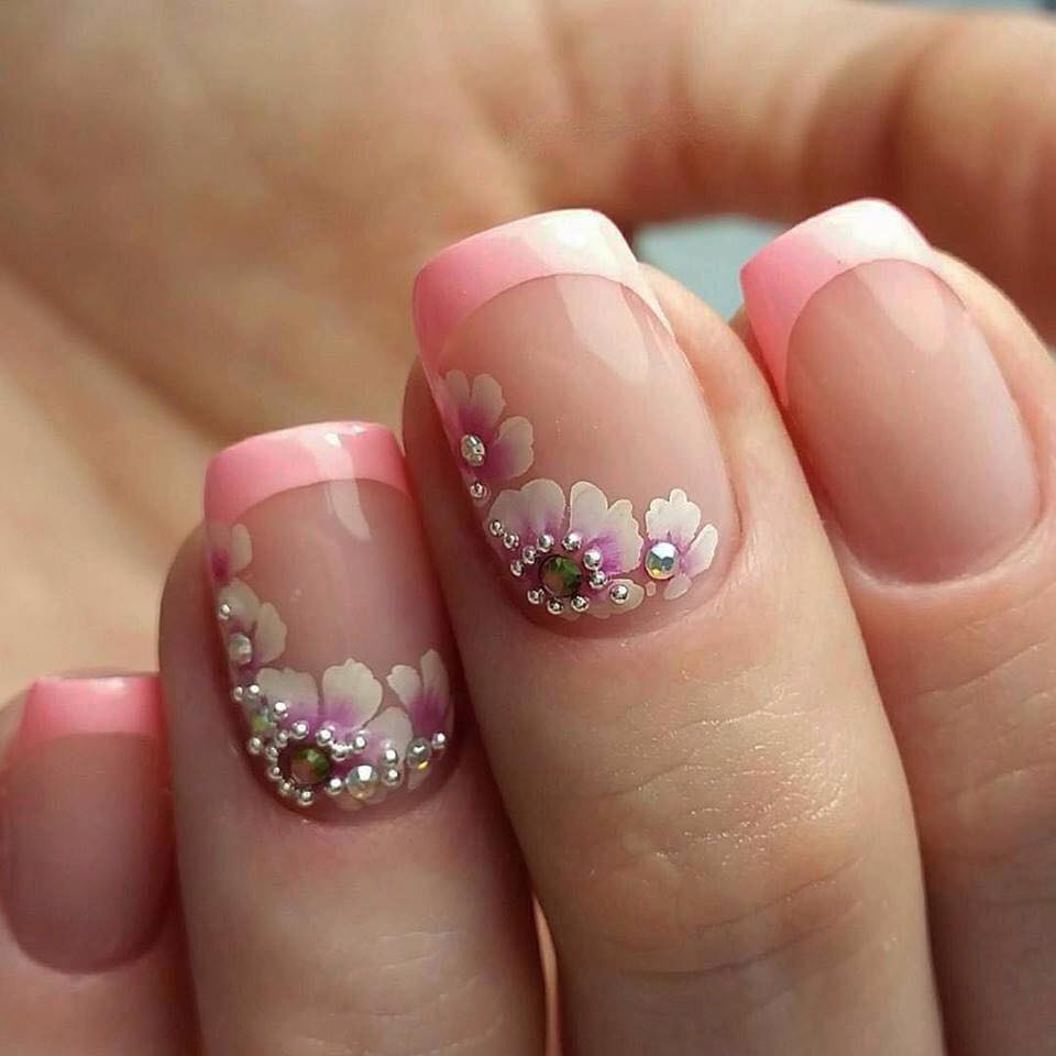Отлично с французским маникюром сочетаются цветочные мотивы. Они сделаю ноготки очень женственными и утончёнными. Можно рисовать на ноготках как по одному цветочку, так и изображать букетики. Можно выделять отдельные ноготки и рисовать цветочные мотивы. Если вы не блистаете художественными способностями, то воспользуйтесь слайдерами.