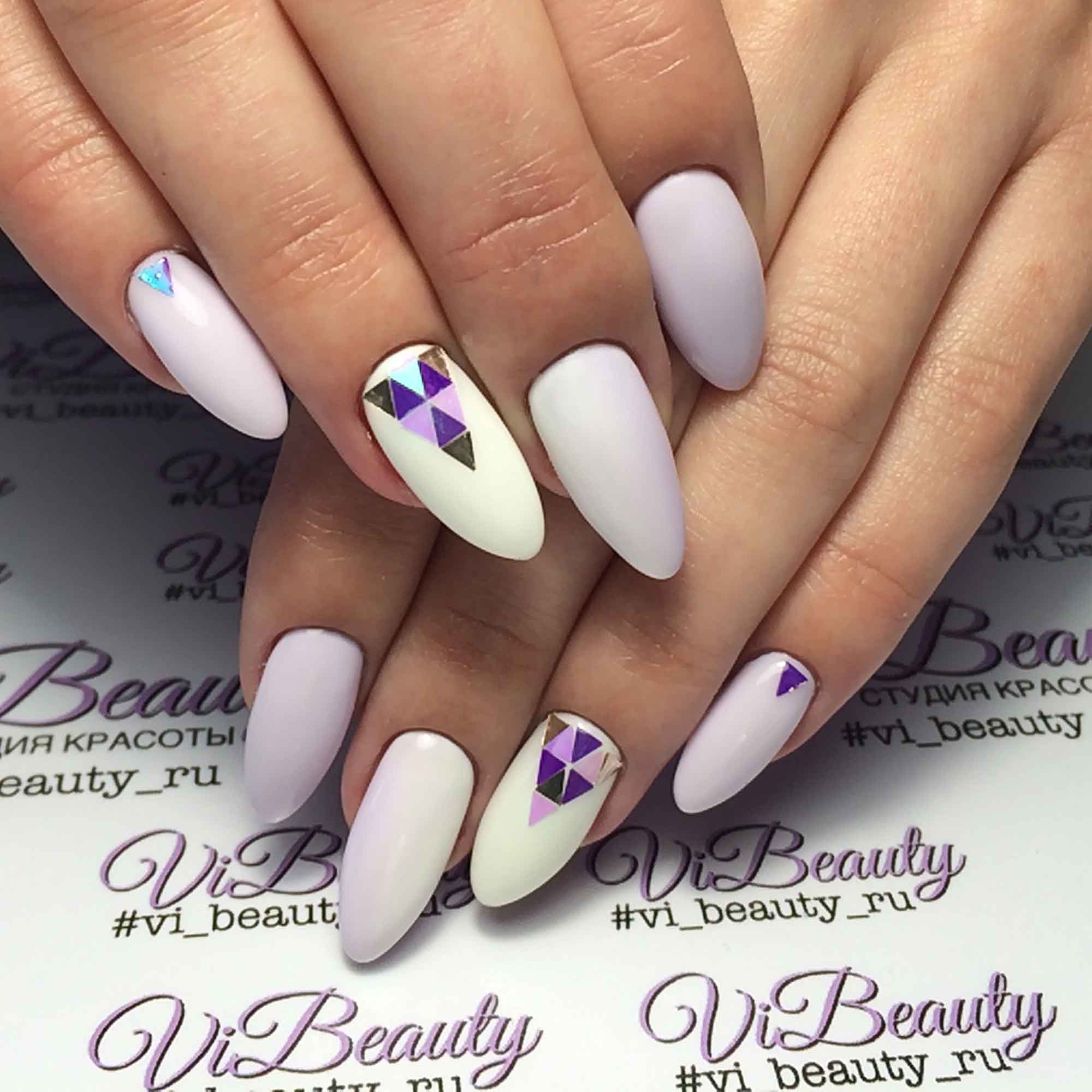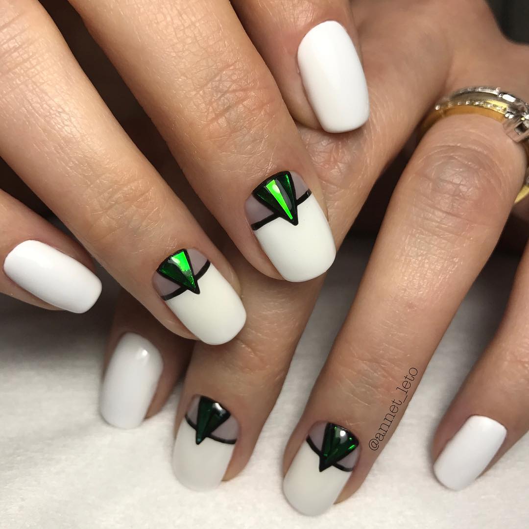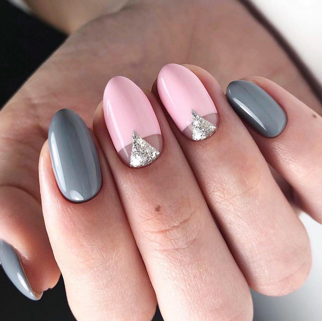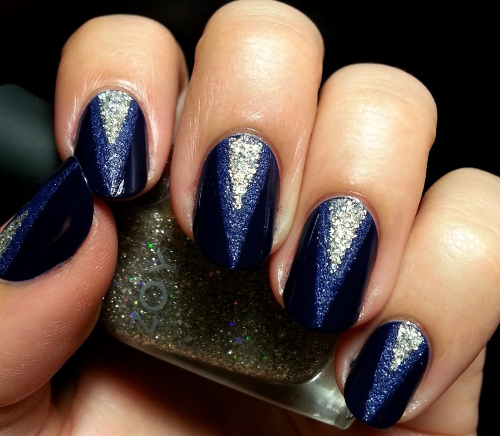 Вариант множество, при важно, чтобы треугольник хорошо просматривался на поверхности ногтя, вписывался в общий нейл-арт. В качестве материала используйте глиттер, фольгированные полосы, негативную технику, стразы и другой декор