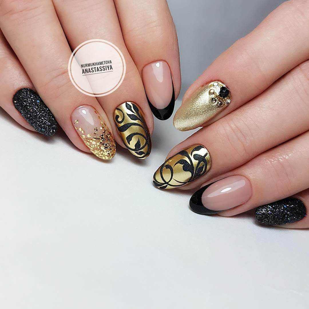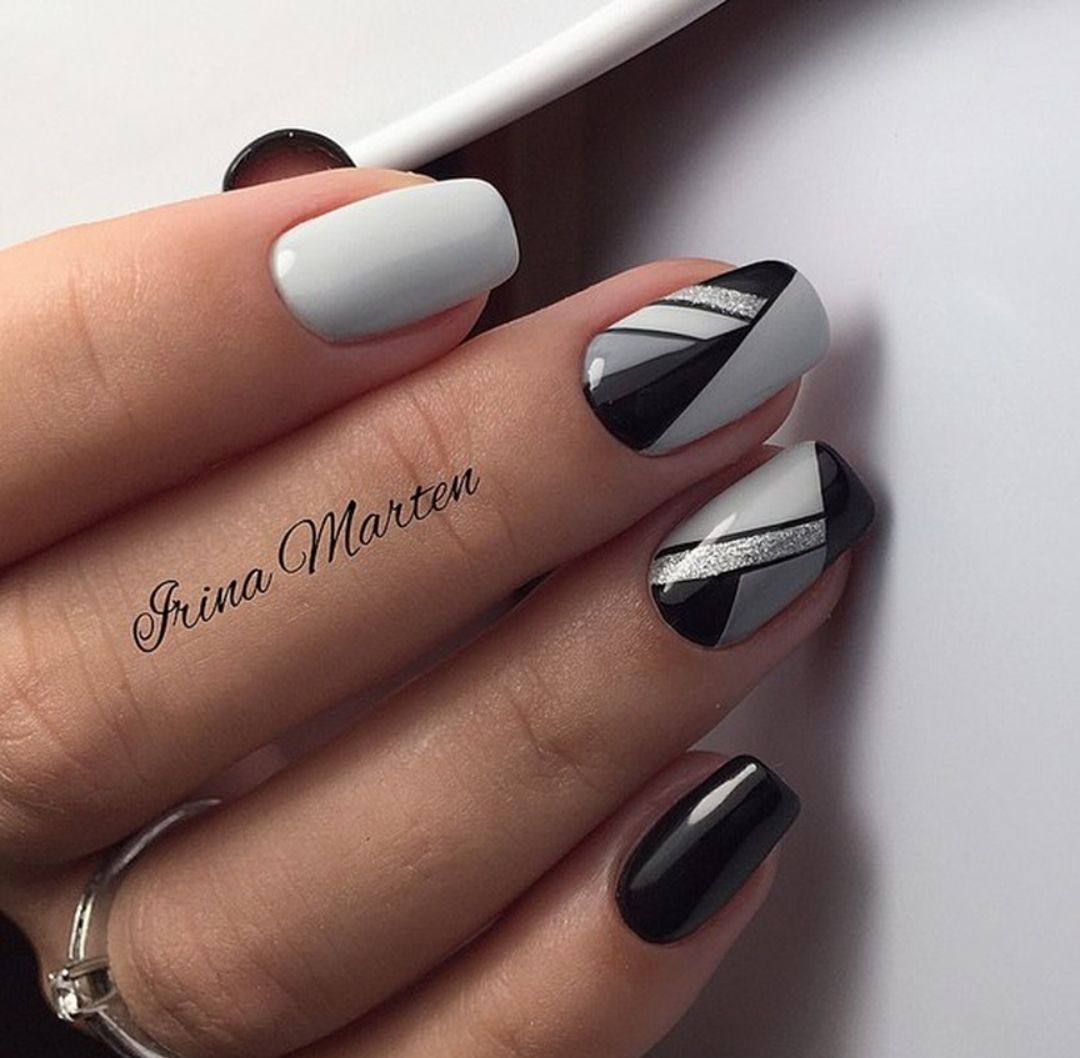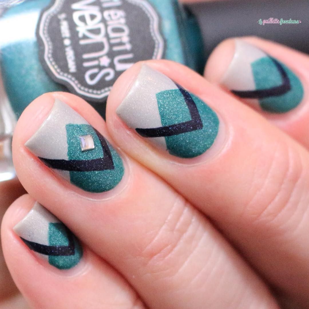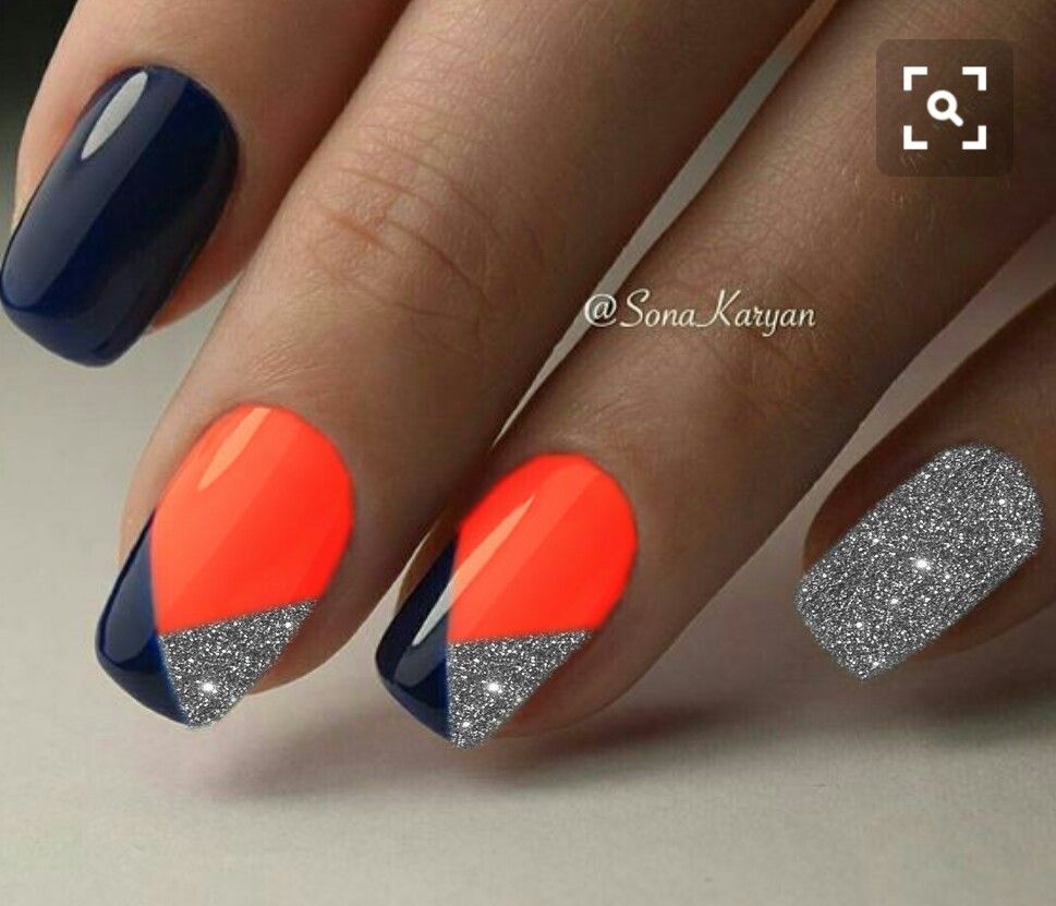 Вариант множество, при важно, чтобы треугольник хорошо просматривался на поверхности ногтя, вписывался в общий нейл-арт. В качестве материала используйте глиттер, фольгированные полосы, негативную технику, стразы и другой декор