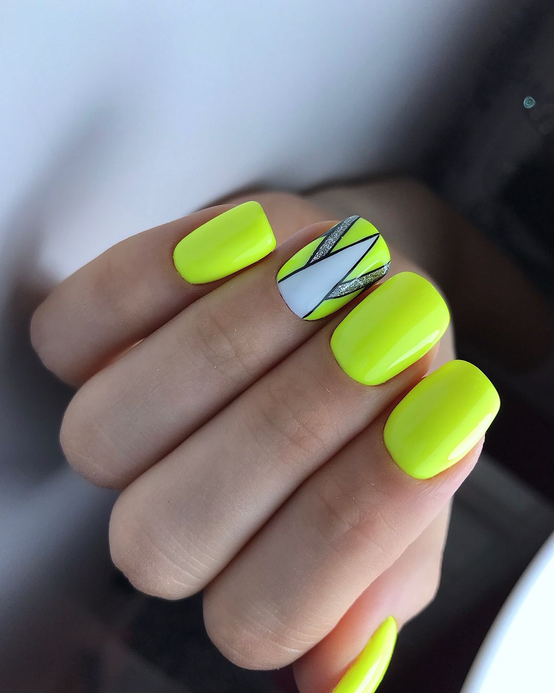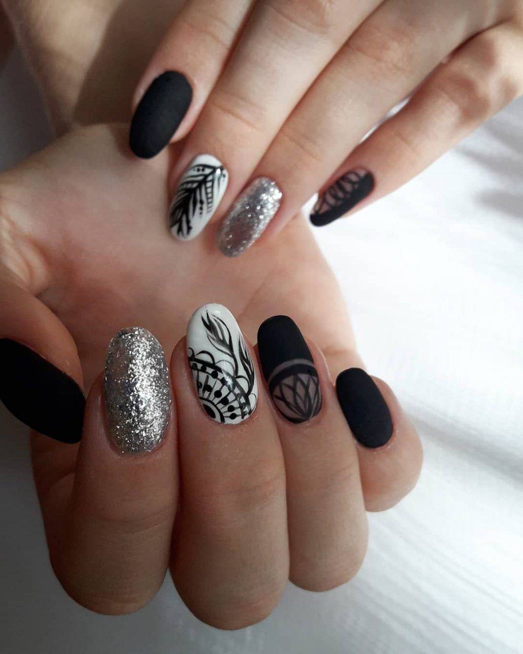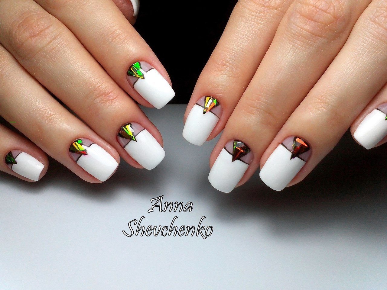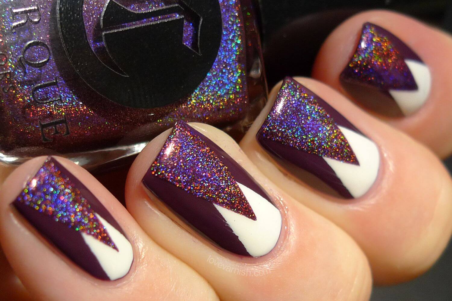 Вариант множество, при важно, чтобы треугольник хорошо просматривался на поверхности ногтя, вписывался в общий нейл-арт. В качестве материала используйте глиттер, фольгированные полосы, негативную технику, стразы и другой декор