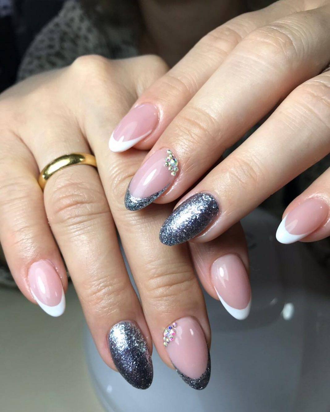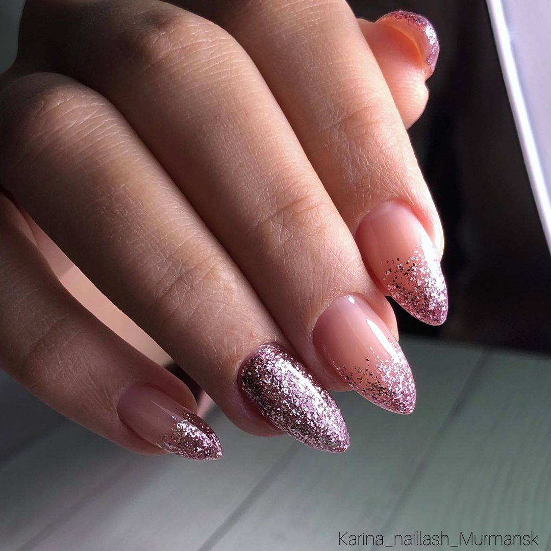 Неплохим вариантом может являться градиентный френч с блестками. Главное, чтобы блестящее покрытие имело правильный переход (редкая россыпь с середины ногтя должна ближе к кончику преобразовываться в насыщенное сплошное покрытие).
