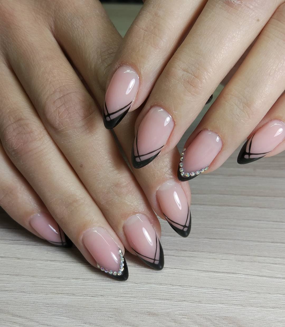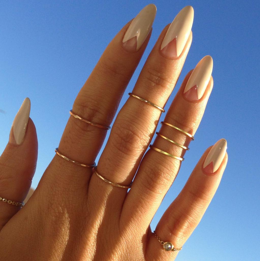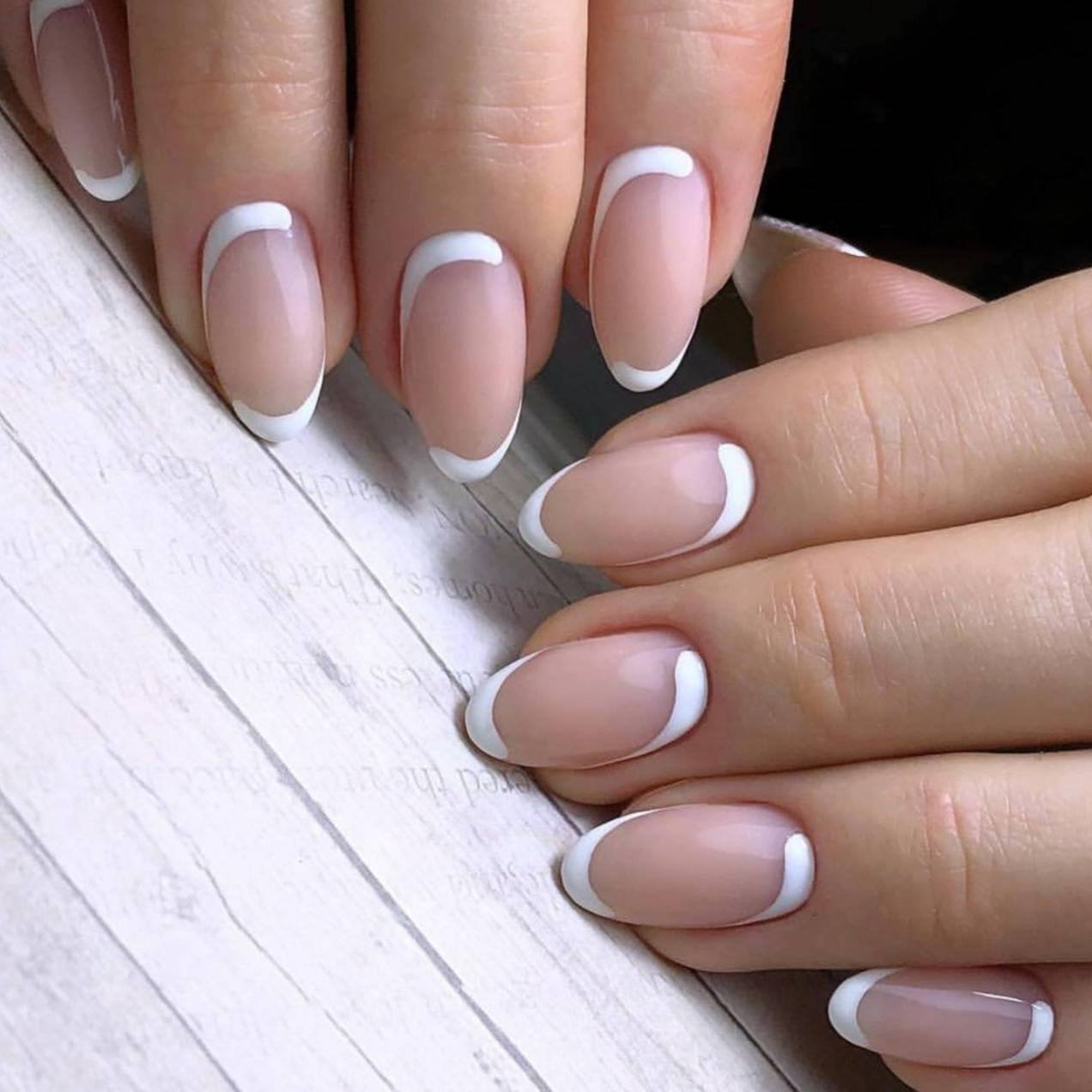 Французский маникюр миндалевидной формы — это самый традиционный вариант нейл-арта. Он повторяет естественную форму ногтей и состоит в нанесении на их кончик полоски белого или контрастного цвета. Обратный френч — выделение лунки ногтя.