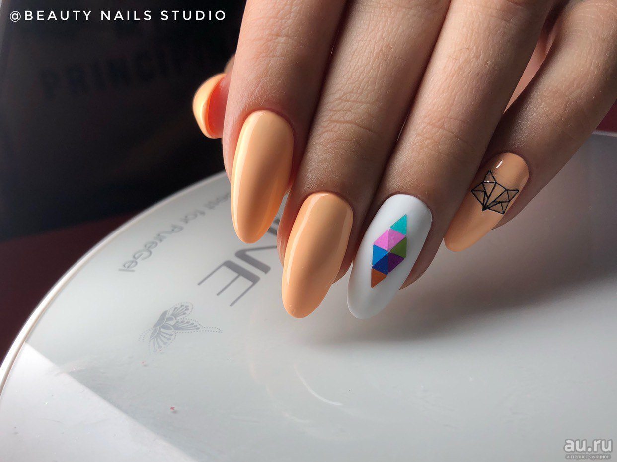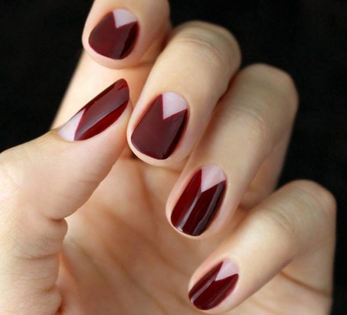 - выделить треугольным дизайном безымянный палец, остальные ногти покрыть однотонным слоем гель-лака