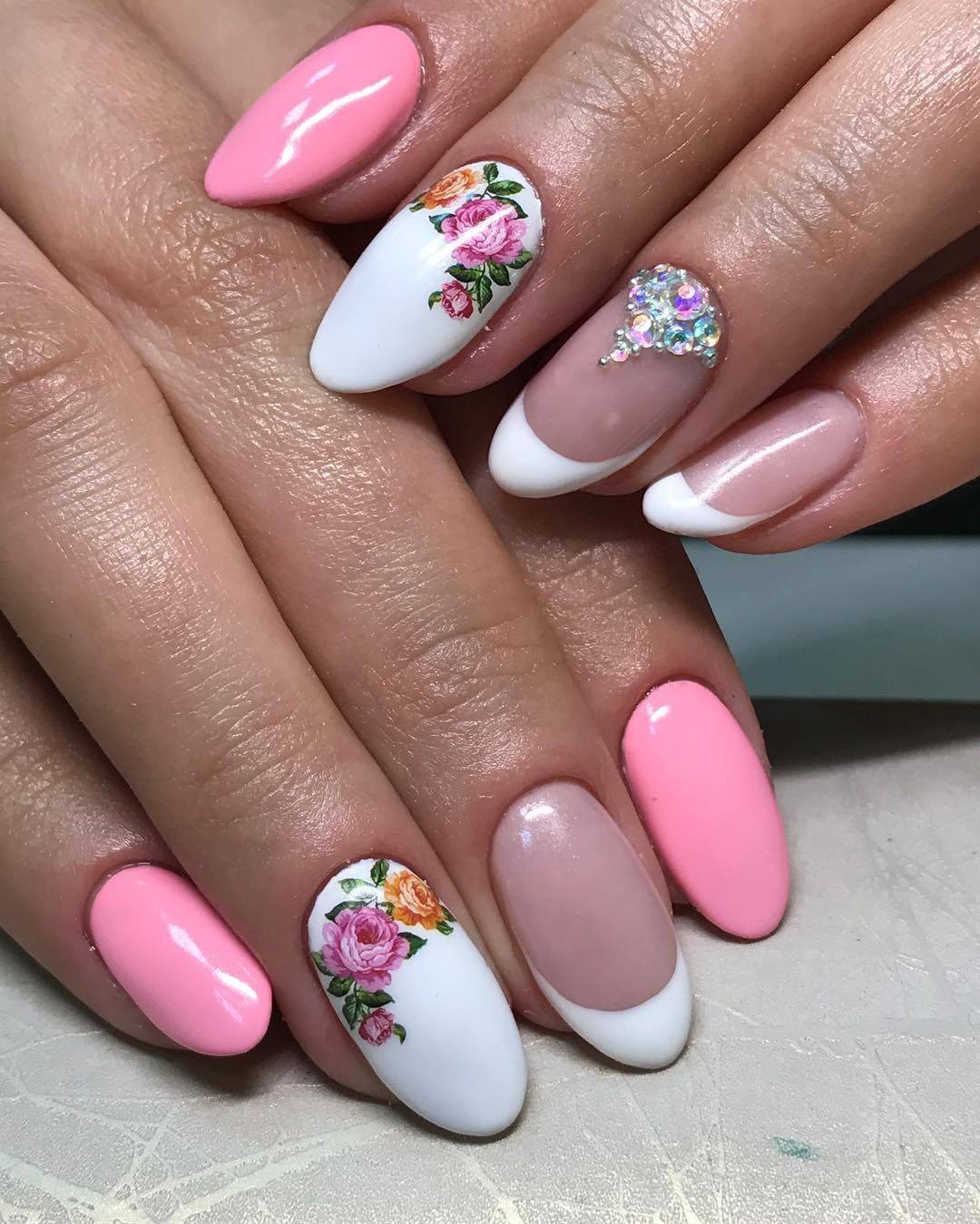 Полоски и клетка, бусины и сверкающие камушки, иней, бархат, икорный дизайн, рисунок любой сложности и какого угодно стиля – это еще что. Фантастически красиво смотрится лепнина и другие объемные варианты. Цветущая сакура, чайные розы, трогательные ирисы, забавные персонажи мультфильмов, народные мотивы – бесконечный полет воображения! А французский маникюр на нарощенных ногтях, выполненный с помощью фотопринтера – это вообще уникальное произведение искусства: пейзажи, рассветы и закаты, достопримечательности, портреты и натюрморты, целые букеты ярких цветов. Про аквариумный дизайн и не напишешь, такую красоту надо видеть собственными глазами! У такого маникюра, помимо некоторой стесненности в быту, только один минус – легко увлечься и забыть, где заканчивается стиль и начинается, простите, колхоз.