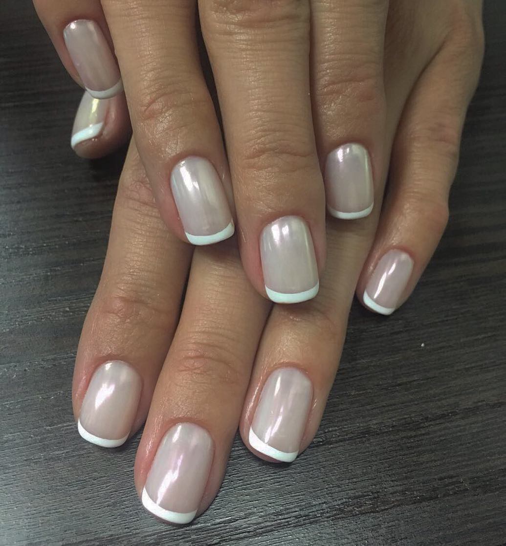 Это специальная пудра, которая втирается в базовое покрытие и создает тон, поражающий своей переливчатостью и игрой света. Креативный вариант для френча на короткие ногти. Самыми популярными разновидностями втирок являются «Майский жук», жемчужная и металлическая пудра.