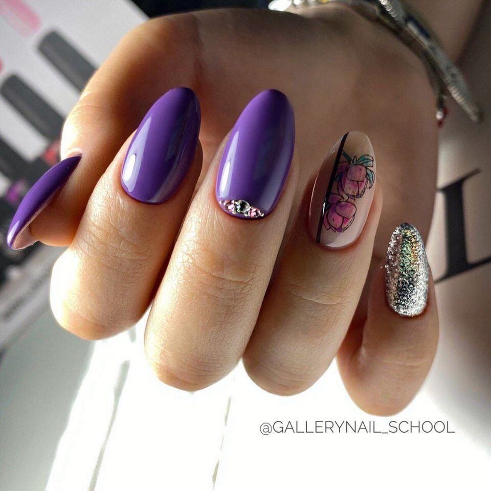 Вариантов оформления ногтей множество, важно правильно сочетать цвета. Отличная идея — сиреневый фон и розовые цветы сверху