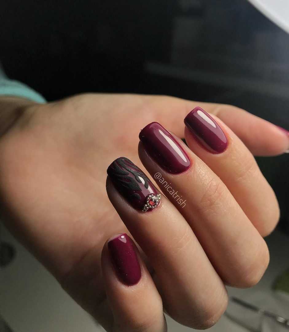Тренд сезона – однотонное покрытие винным цветом и последующий декор черными стразами. Располагать декор лучше в прикорневой зоне. Выложите инкрустацию черными стразами или бульонками на нескольких ноготках.