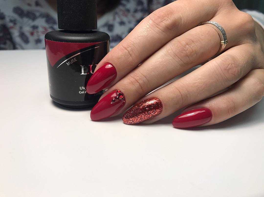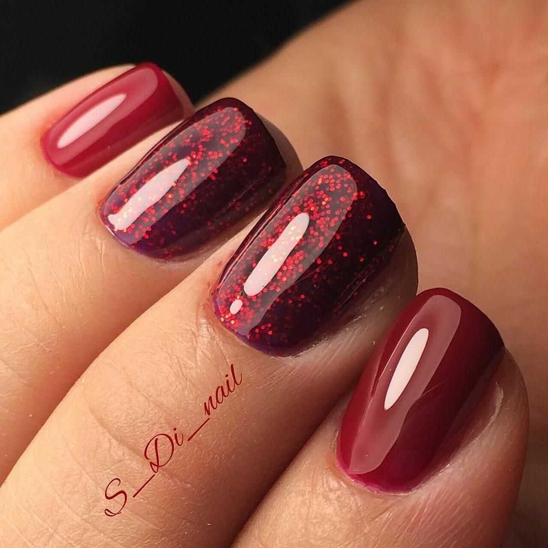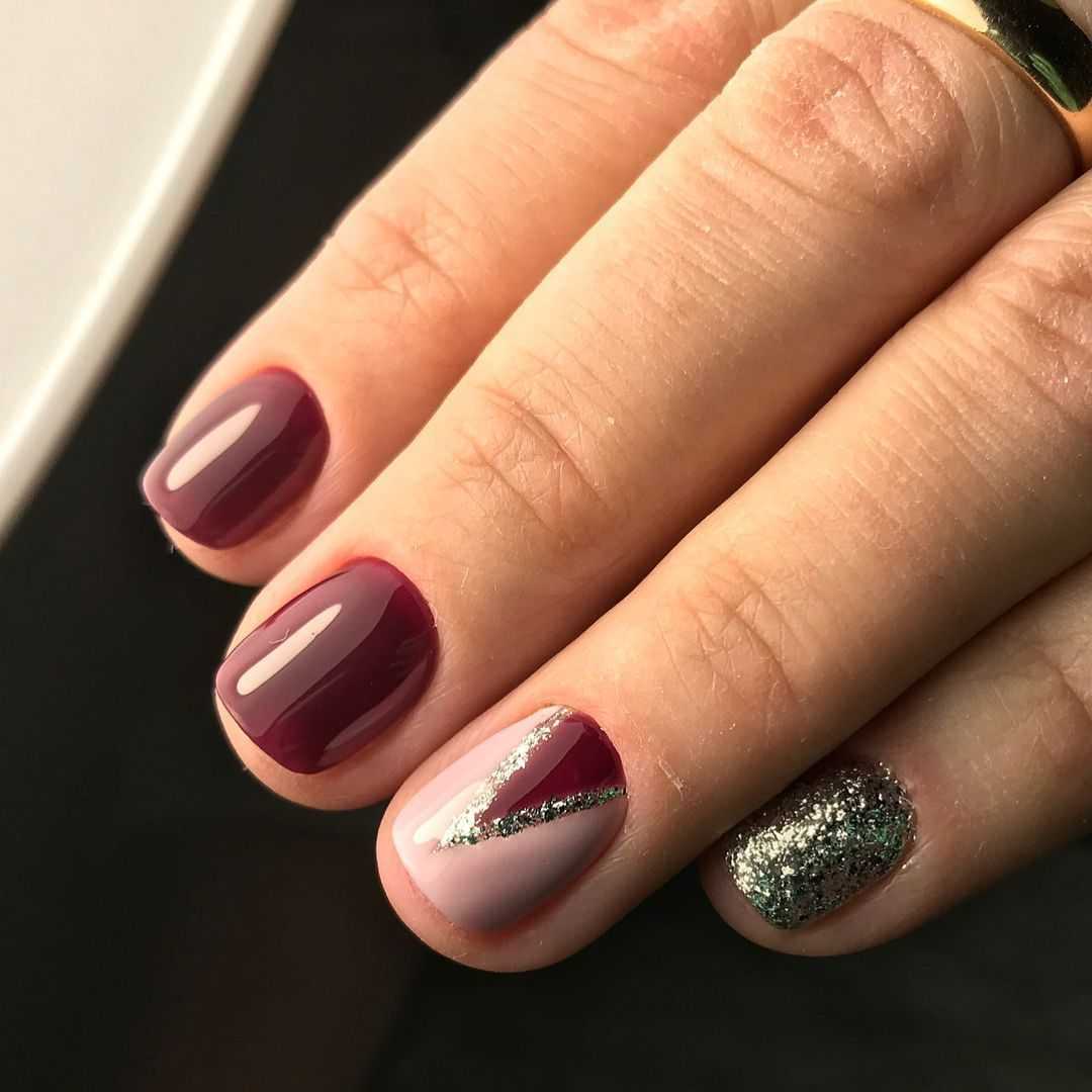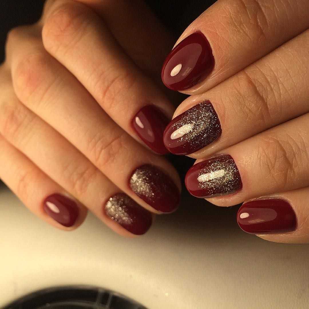 Блестки, находящиеся в составе лака, могут быть либо крупными, либо в виде пылинок. Золотом можно окрасить только один ноготь, а остальные оставить в бордовом цвете.