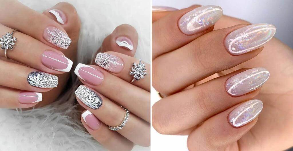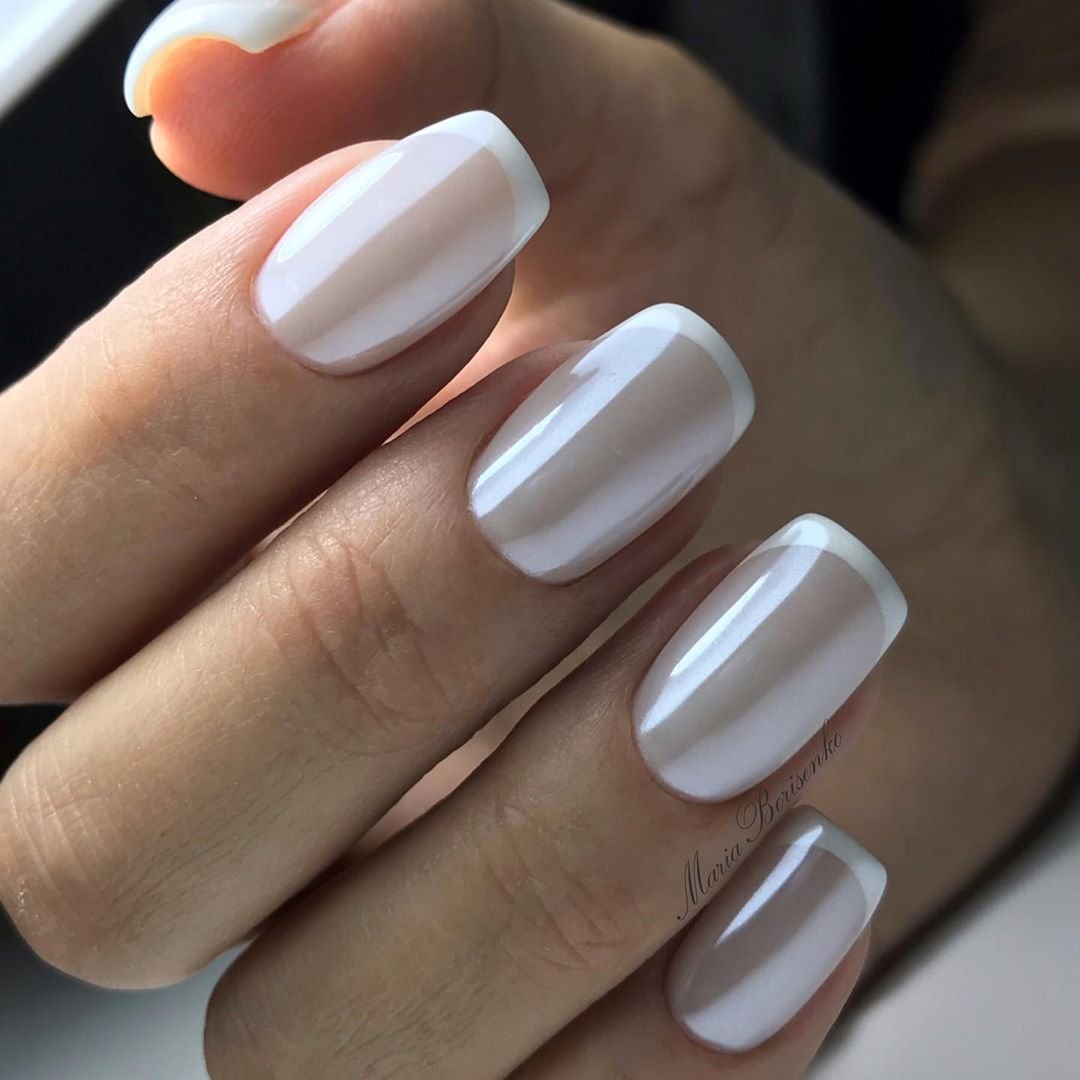- френч-маникюр. Френч с перламутровыми кончиками — отличный способ сочетания классики и жемчужного дизайна. Проявите креативность, играя с цветами кончиков и основы. Для коротко длины подойдут тонкие варианты улыбки;
