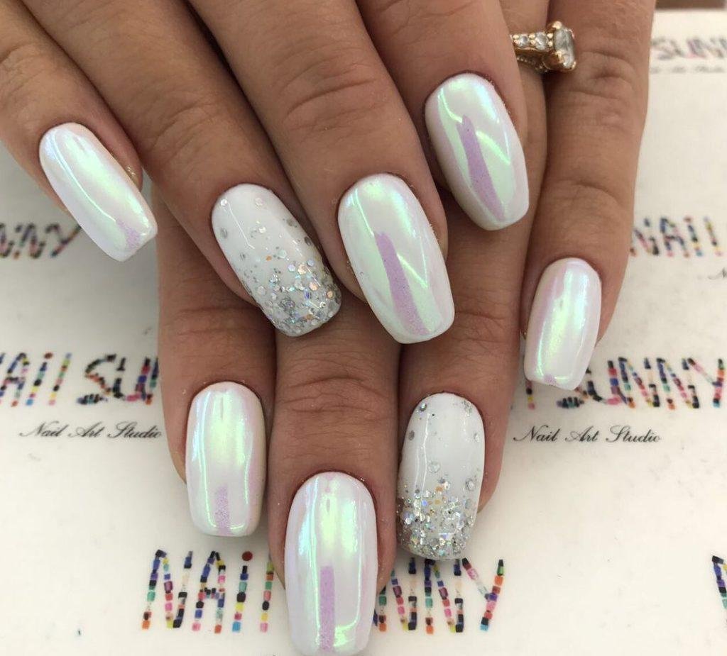 Роскошное чередование жемчужной втирки и блестящих ноготков не может не впечатлять!